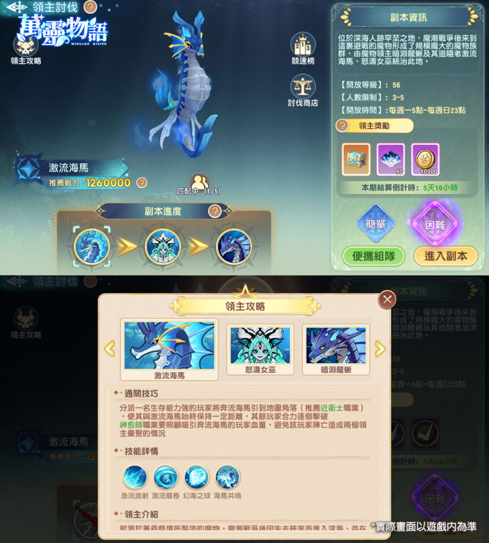 副本背景設定於人跡罕至的海底裂谷,魔潮戰爭結束後,部分強大魔物潛逃至此,逐漸形成規模龐大的魔族勢力。玩家將面對三大領主的輪番登場,統領魔物軍團的「暗淵龍蜥」、冷血殘忍的「激流海馬」與詭譎莫測的「怒濤女巫」。唯有齊心協力、戰術分明,方能突破深淵封鎖,搶下這場終極戰役,收穫豐厚珍稀獎勵!