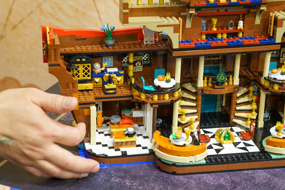他表示,樂高強調呈現作品的時間線演進非最重要,而是提供演員與布景,讓玩家能自由重現或創造故事。內裝細節內部有雙火旋樓梯、精緻地板、餐桌座椅,以及卡普的辦公室。