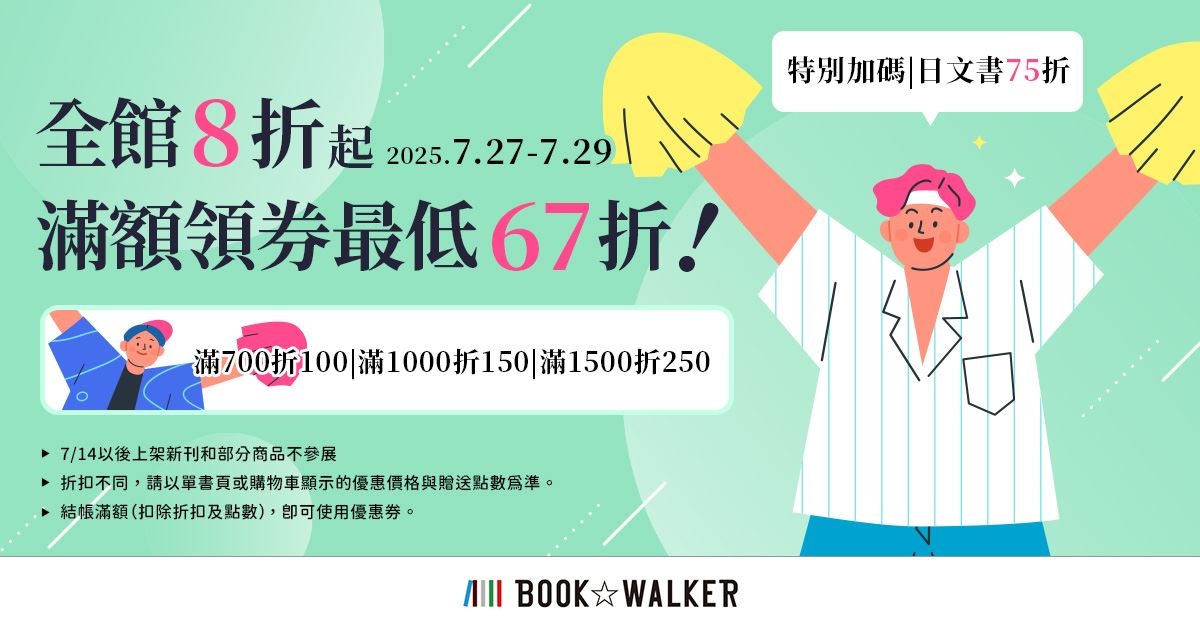 最後為讀者帶來的是全館優惠情報,7 月 27 日至 7 月 29 日,BOOK☆WALKER 將推出限時三天全館 8 折起活動,滿額領優惠券再折抵,最低 67 折就能收藏最愛的作品!活動期間特別加碼日文書全館 75 折。無論是想快樂開追夏季新番作品、人氣續作,還是購買日本偶像明星寫真、作品畫冊、流行雜誌都能便宜入手。週末就到 BOOK☆WALKER 享受美好的閱讀饗宴吧!