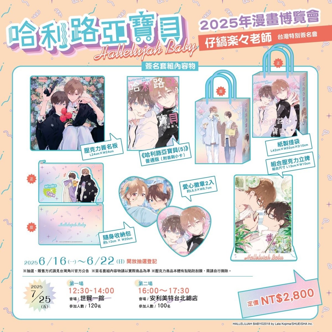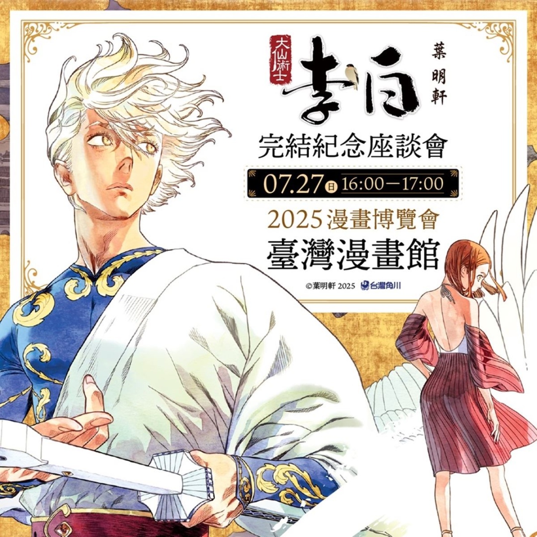 此外,本週五(7/25)將舉辦《哈利路亞寶貝》作者仔縞楽々簽名會,推出會場及安利美特場資格套組共 220 組已全數售罄,充分展現粉絲們的期待!還有將於週日(7/27)隆重登場的《大仙術士李白》漫畫家葉明軒完結紀念座談會(16:00-17:00),當日 15:00 至台灣漫畫館攤位,向台灣角川工作人員出示《大仙術士李白 (8)(完)》漫畫單行本即可領取簽名號碼牌一張。號碼牌限額 50 位,發完為止,有興趣的讀者千萬別錯過囉!