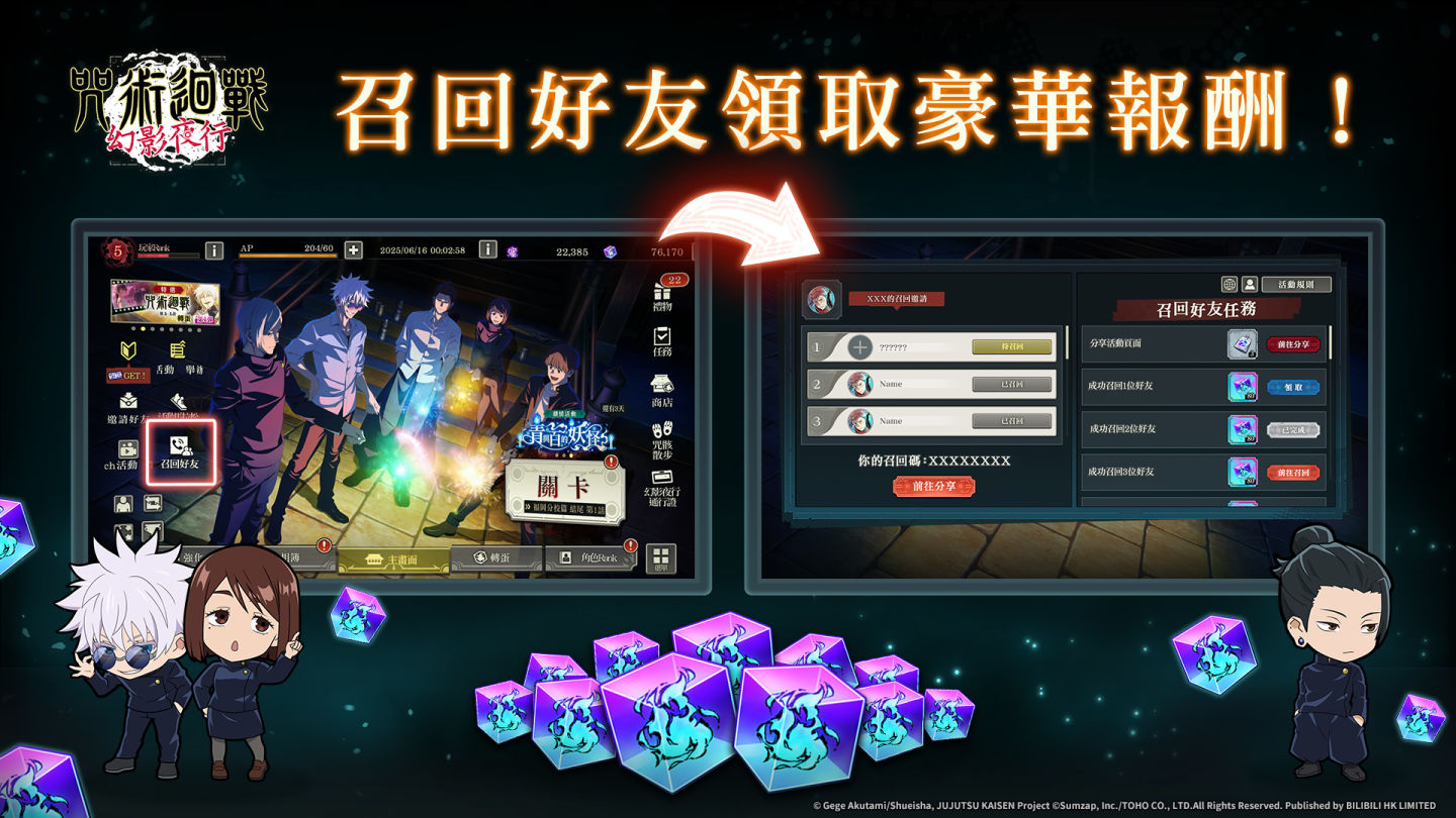 此外,遊戲內也同步開放全新好友召回網頁活動,使用專屬召回碼邀請近 7 天內未登入《咒術迴戰 幻影夜行》的玩家登入遊戲並完成綁定,即可領取迴珠報酬!快邀請好友,共享好禮吧!