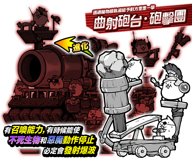 期間限定稀有轉蛋「革命軍隊鋼鐵戰團」新角色「曲射砲台・砲擊團」登場!帶來革命的超級武器,新成員前來報到!「曲射砲台・砲擊團」有召喚能力,有時候能使不死生物和惡魔動作停止,且必定會發射爆波!