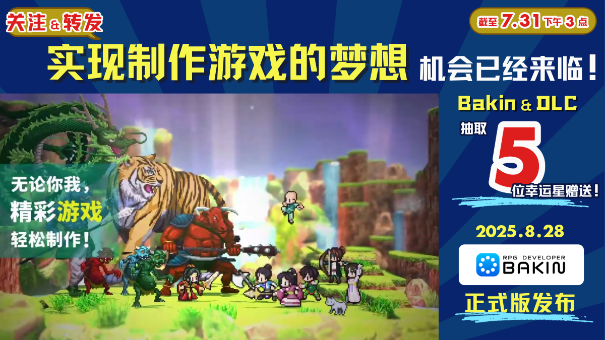 此外,如果轉發時帶上「#RPGBakin#」,或在評論/轉發區告訴官方想用《Bakin》製作的遊戲,中獎機率還將提升,歡迎大家參與。