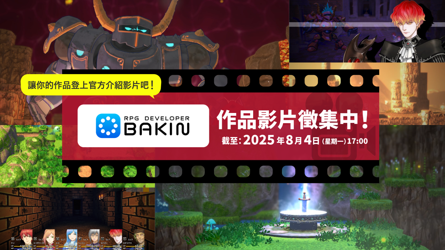 為了紀念《RPG Developer Bakin》正式發售,官方先已開始徵集用戶們製作的遊戲作品視頻。您投稿的視頻將會以「用戶作品介紹視頻】的形式整合公開。要不要試著將您的原創作品分享給大家,使得能夠駕馭多彩類型遊戲的《Bakin》之魅力傳達給更多朋友呢?