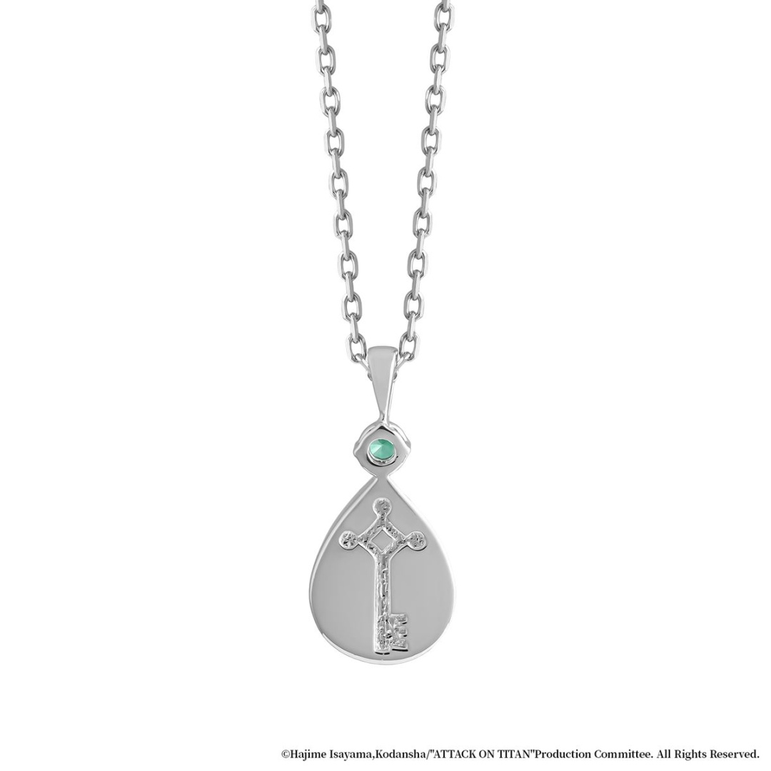 母親被巨人所殺害,淚流滿面地誓言復仇的場景為靈感。設計了一個以破碎磚牆街景為主題的鑲座,鑲嵌象徵淚水的水滴形瑪瑙。瑪瑙寓意「忍耐」和「成功」,其深邃的黑色象徵艾連的心情。瑪瑙上方點綴著閃耀的綠色立方氧化鋯,彷彿艾連眼睛的顏色。背面則刻有艾連隨身攜帶的地下室鑰匙圖案。