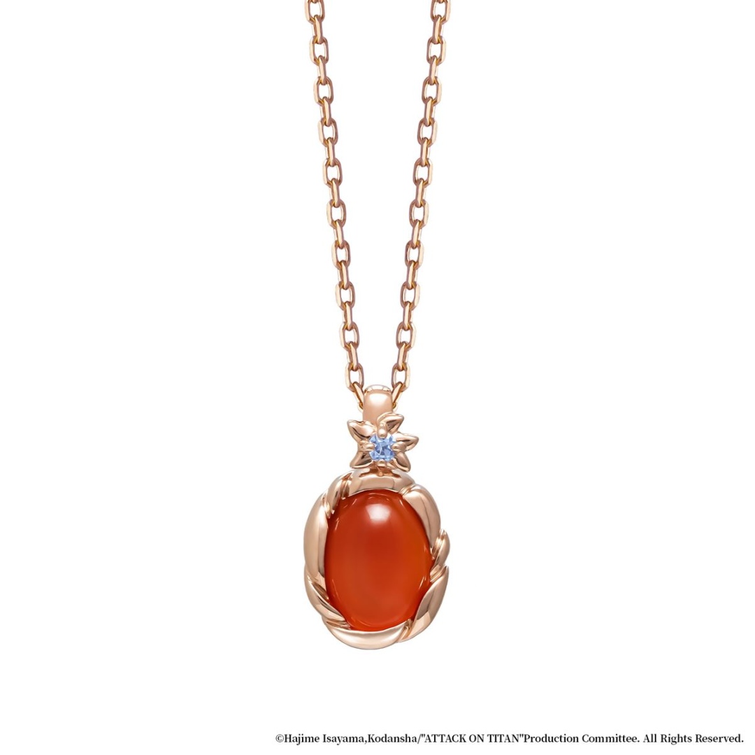 靈感來自米卡莎被圍上圍巾的場景。選用象徵「羈絆」、「守護」與「熱情」的紅瑪瑙,呼應圍巾的顏色。鑲座設計呈現布料柔軟感,整體表現米卡莎被圍巾環繞的樣貌。墜飾扣部分採用花朵造型的鑲座,上面鑲嵌藍色立方氧化鋯,象徵該場景中腳下盛開的花朵。設計中融合了平時冷酷的米卡莎偶爾展現可愛的一面。