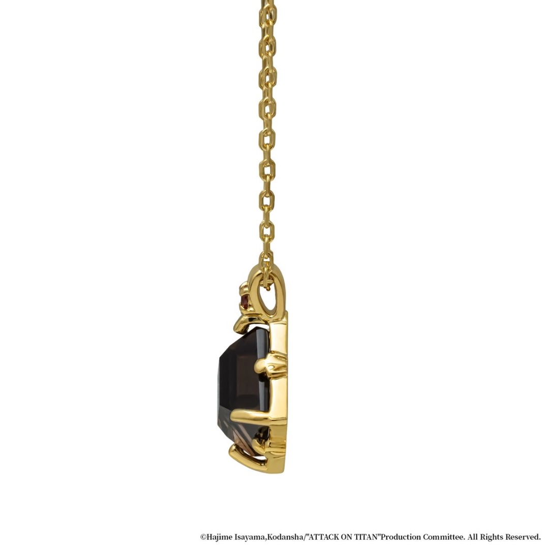 靈感來自失去了重要之人的漢吉陪伴著米卡莎悲傷的時刻,我們以擁有「責任感」與「安心感」寓意的煙燻水晶作為主石,表現出漢吉的髮色。主石上方鑲嵌著代表她眼睛色澤的立方氧化鋯,透過寶石的色彩與俐落的造型,展現出漢吉的智慧與獨特個性。在鑲座設計上,以圍繞著煙燻水晶四周的方式,呈現出至今為止所戰鬥過的巨人們的身影。
