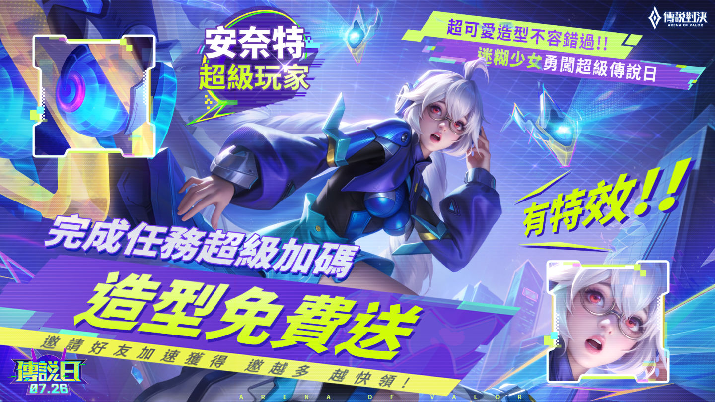 可愛又迷糊的安奈特,也將於傳說日中大放異彩。活動期間只要完成每日任務及邀請回歸好友互助,就能獲得情義值,達指定門檻即可免費兌換包含「超級玩家 安奈特」在內的造型 6 選 1 選擇卡,邀請越多好友參加,即可越快完成任務!