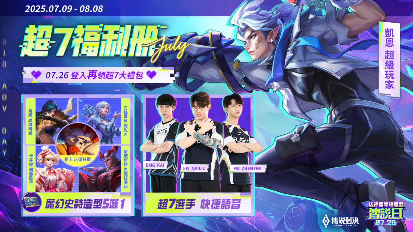 即日起至 8 月 8 日期間完成指定任務,提升「超7福利冊」等級,即可解鎖豐富獎勵。從魔幻史詩造型、永久特效、職業選手語音,到傳說標籤造型幸運箱,等著玩家領取。隨著等級提升,獎勵也越來越精彩,是今年傳說日中不容錯過的重頭戲之一。