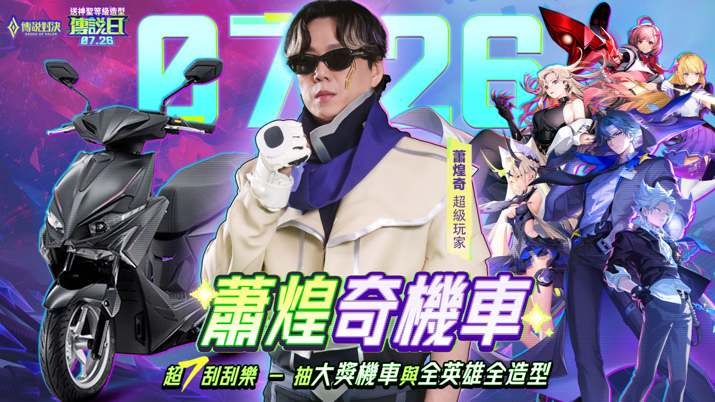 活動期間不僅能免費獲得凱恩神聖等級造型,更有機會抽中機車、全英雄全造型等夢幻大獎。今年傳說日也特別攜手「超級玩家」蕭煌奇合作,只要當天登入並輸入專屬序號「AOVDAY726」,即可領取傳說日神秘虛寶盲盒,一同感受超7傳說日的熱血與驚喜!
