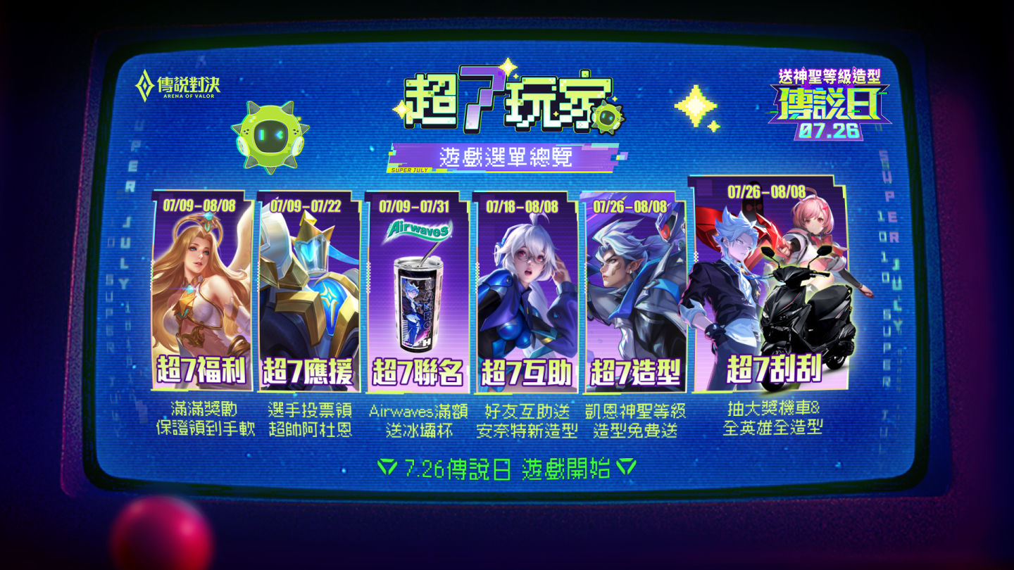 同時,備受矚目的「超7刮刮樂」將於 7 月 26 日正式開獎,豪氣送出機車、全英雄+全造型等夢幻級大獎,玩家最多可獲得 6 次抽獎機會,保證獲得 710 點限時點券。
