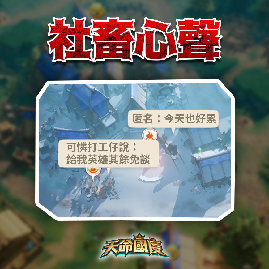 此外,《天命國度》官方粉絲專頁同步開跑「社畜心聲」留言活動,邀請玩家踴躍投稿工作或是生活當中的辛酸血淚,玩家只要於活動貼文下方留言分享自己的心聲,即可獲得限量虛寶「3,000 免費寶石」(相當於 30 顆茶葉蛋)!