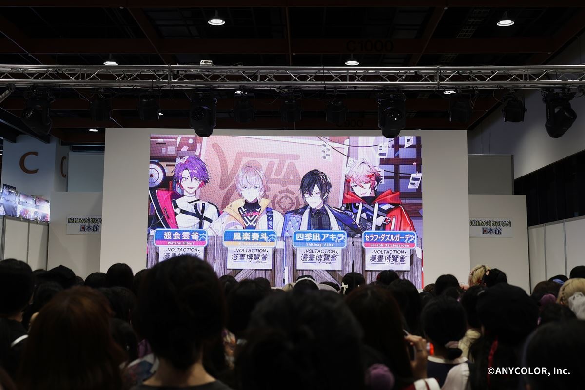 另一場重頭戲是 NIJISANJI 大勢男團 VOLTACTION,粉絲們早早就準備好各式手燈、指娃和徽章等等應援物,趕緊跟舞台螢幕上的主視覺畫面拍照。VOLTACTION 本次演出主題有分組問答競賽與 mini live,相當豐富的演出內容讓粉絲馬上尖叫歡呼。雖說要和平決定哪一組先攻,卻馬上爆出 セラフ 包包裡面有疑似暗器,成員們不禁吐槽「真的能和平決定嗎?」