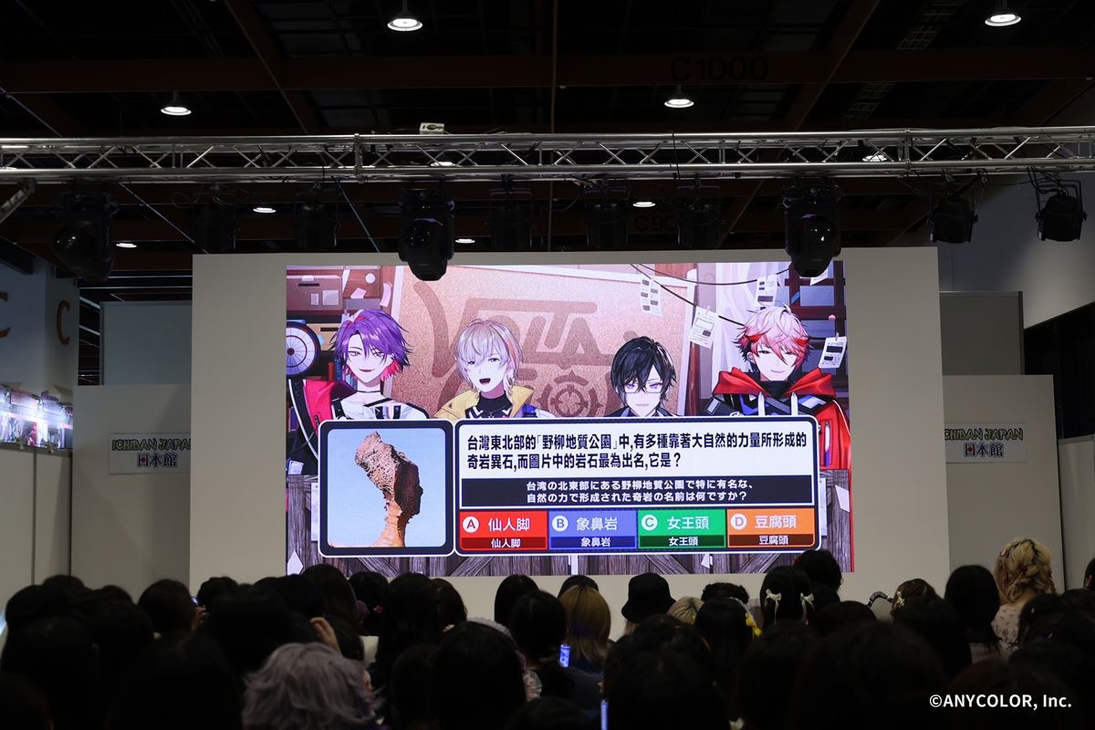 問答題目包含台灣美食、觀光勝地、文化與 VOLTACTION 四大主題,先攻為四季凪アキラ和セラフ・ダズルガーデン,第一題馬上輕鬆答對,而渡会雲雀和風楽奏斗則遇到難題「台灣的父親節是幾月幾號?」,先笑說「連日本的是哪一天都不知道」,可惜猜錯答案。VOLTACTION 相當認真答題,數次向翻譯員請教中文發音並嘗試念出來,超萌的發音讓粉絲們數度尖叫。