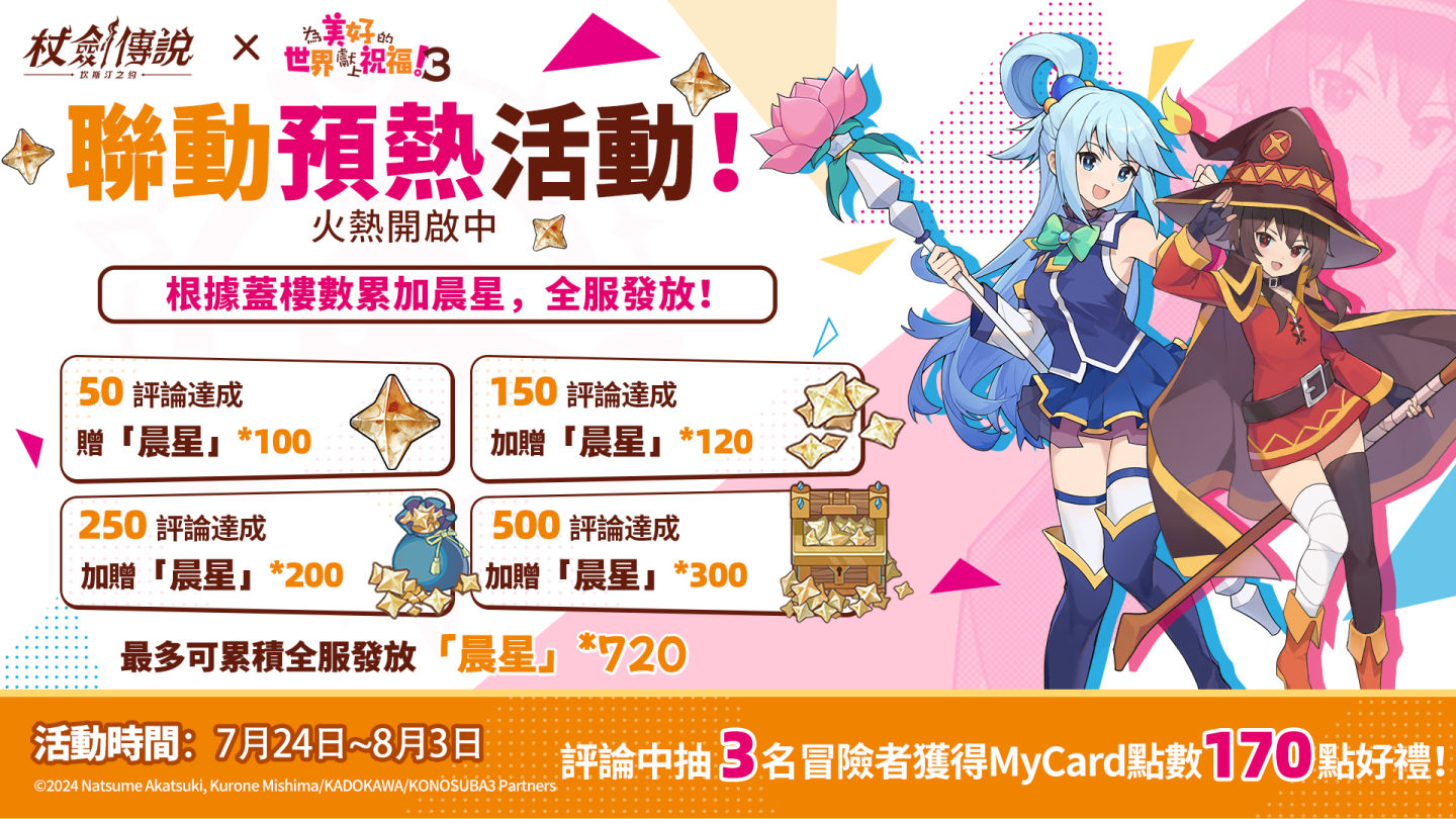 LTGAMES GLOBAL 宣布,放置 RPG《杖劍傳說:坎斯汀之約》與動畫《為美好的世界獻上祝福!3》的聯動限定活動,自 2025 年 7 月 29 日至 8 月 15 日正式開幕!