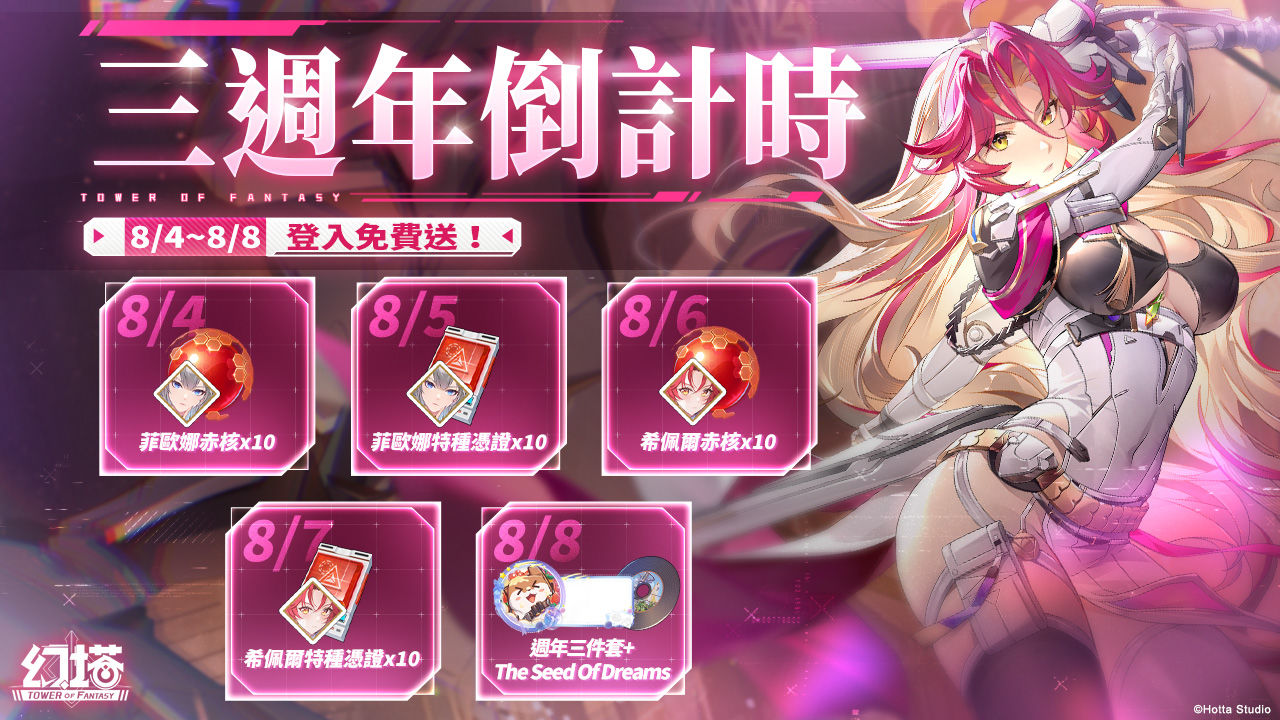 為歡慶《幻塔》上市三週年,同時感謝授權者的支持與喜愛,營運團隊特別規劃多項限定活動及福利回饋授權者。即日起登入遊戲,並達成指定條件即可獲得菲歐娜赤核、菲歐娜特種憑證等豐富虛寶好禮,2025/8/8 當天登入遊戲更壓軸送出週年三件套限定外觀裝飾及限定 CD-The Seed Of Dreams。