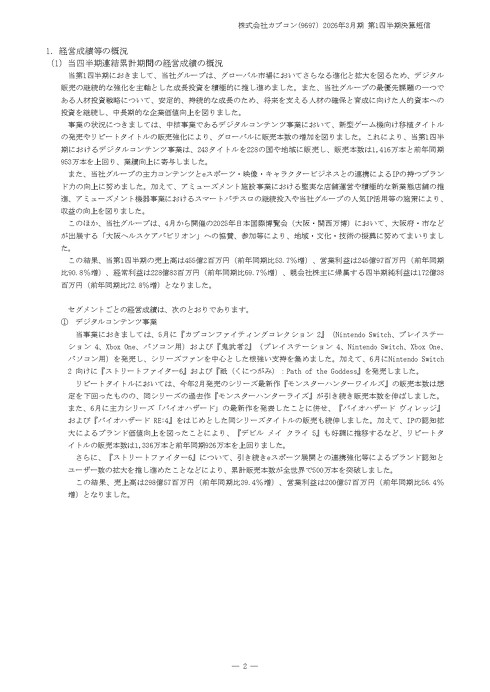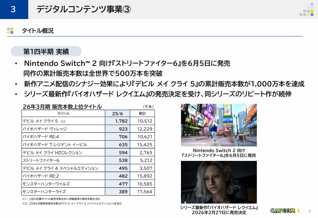 然而財報也揭露《魔物獵人 荒野》後續在本季度銷售表現「低於公司內部預期」。儘管該作自發售以來,全球銷量突破 1000 萬套大關。但後續在本季度的銷售動能似乎未能達到卡普空設立的極高內部目標。但相對的前作《魔物獵人崛起 破曉》卻在本季度銷量持續攀升,並在 6 月宣布破千萬。如果以 3 月時宣布的銷量突破 1010 萬,以及到 6 月 30 日則是 1058 萬,等於該季後續銷售僅有 47 萬。