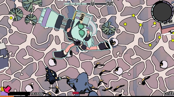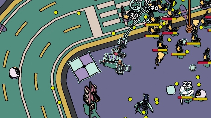 而當夜晚到來後,則將會變成俯瞰視點風格的動作遊戲玩法。玩家需要在這個卡通漫畫風格呈現的畫面中,將來自四面八方的敵人給一一打倒。同時本作還將會加入隨著戰鬥進行,可以獲得各種隨機強化要素的 Rougelike 設計,讓玩家的戰鬥更加事半功倍。