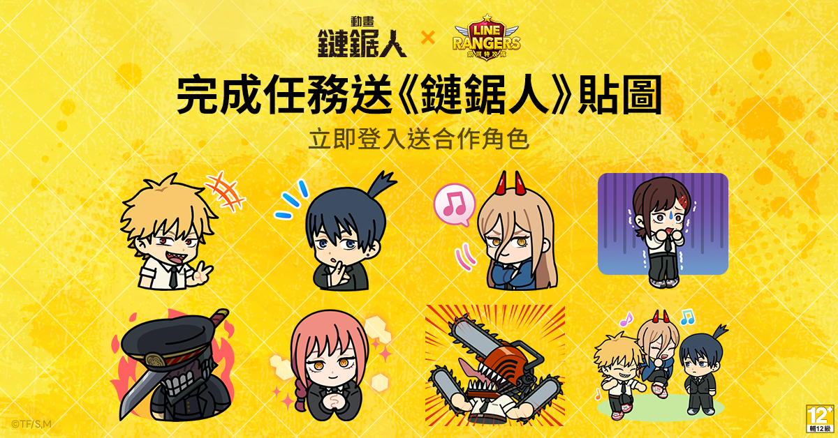 活動期間中,為紀念與電視動畫《鏈鋸人》合作活動將推出共 8 種圖案的限定 LINE 貼圖。只要通過 15 次合作特殊關卡1即可獲得。