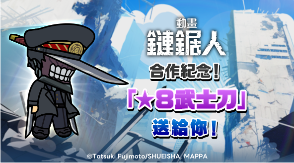 合作活動期間中,「淀治」、「早川秋」、「帕瓦」、「小紅」、「武士刀」將作為合作限定 Rangers 登場之外,同時還有以《鏈鋸人》常見物品為造型的合作裝備同步開跑!另外,只要在合作活動期間,登入《LINE Rangers 銀河特攻隊》就可獲得合作限定 Ranger「武士刀」。