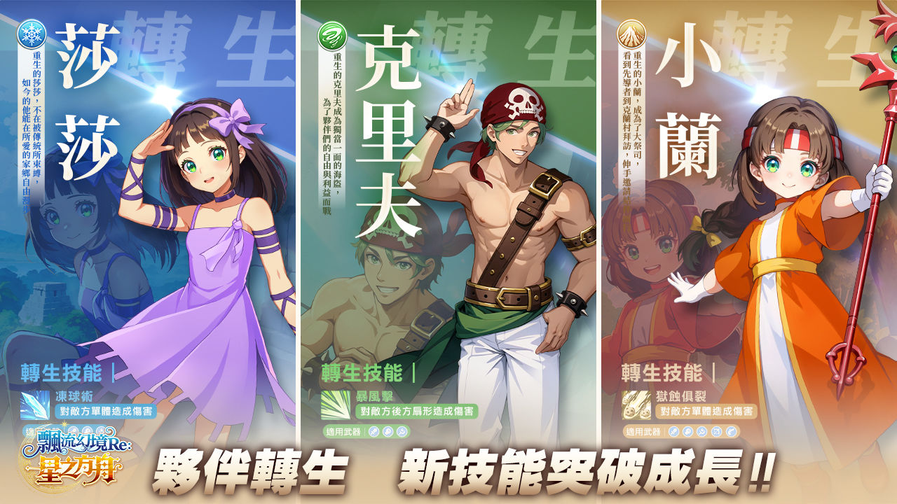 歷經冒險洗禮,夥伴們也陸續迎接全新進化!首發確定莎莎、克里夫、小蘭、以及從未在系列作中突破過的「亞雷斯」正式開放轉生機制!