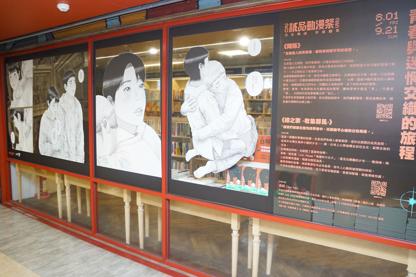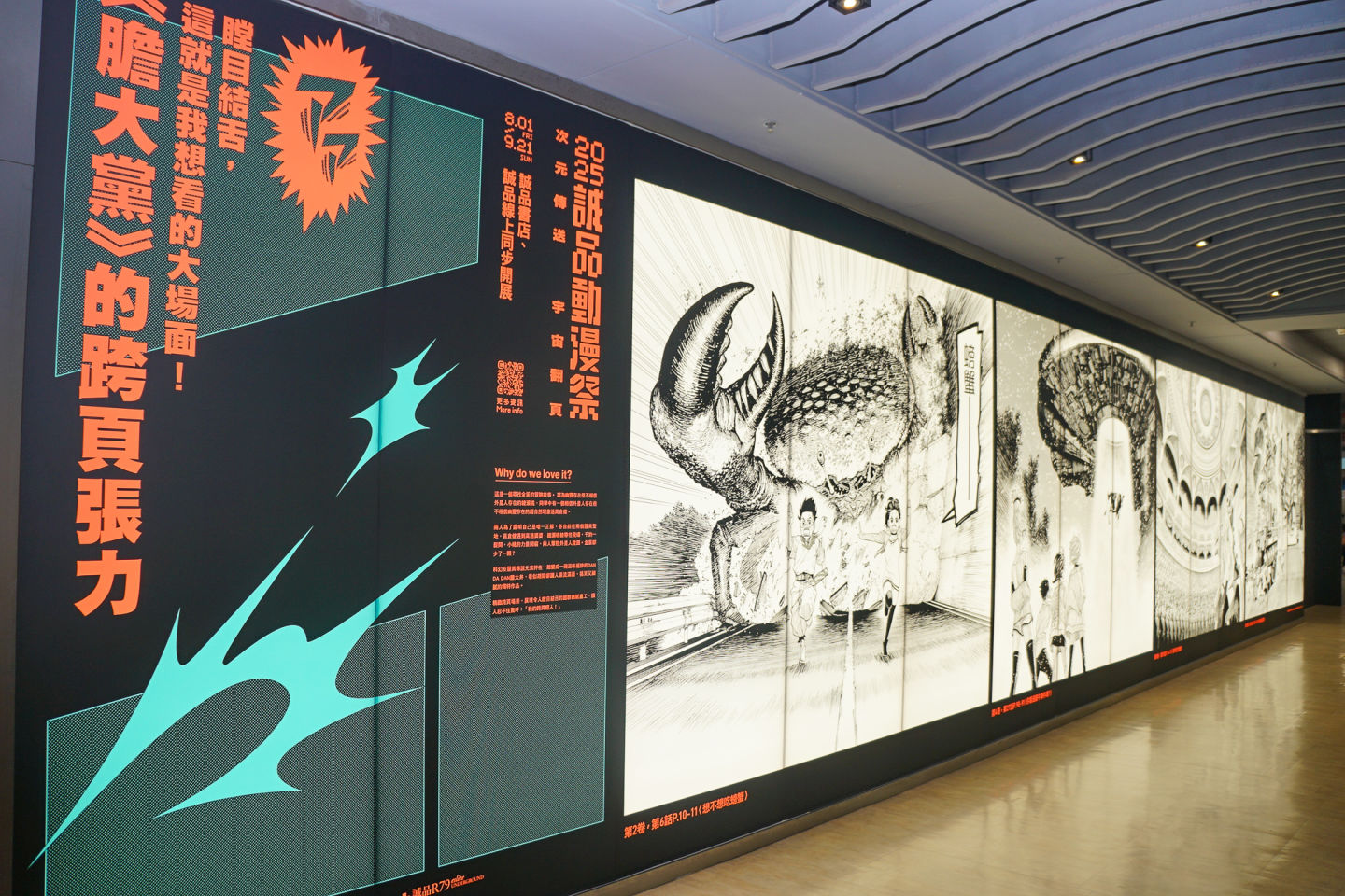 全台最長書街「誠品R79」本次以300米長的「漫畫名場景之路」亮相,集結了 12 部台灣漫畫作品打造主題櫥窗,包含榮獲日本國際漫畫獎銀獎的《芭蕉的芽》、勇奪金漫獎「青年漫畫獎」及「年度漫畫大獎」的《用九柑仔店》,以及受矚目的BL作品《16647》等。近期話題日漫如《膽大黨》、《SAKAMOTO DAYS 坂本日常》及《為了與你慢步宇宙》也以40米巨型光盒形式呈現。