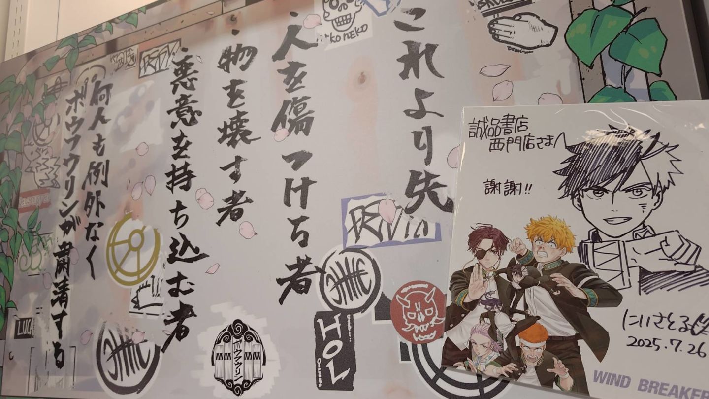 誠品西門店針對廣受歡迎的少年漫畫《防風少年》,3 F書店區域設置了漫畫場景還原區及角色等比例互動立牌,供參觀者沉浸式體驗,並提供「防風鈴總長梅宮一摸頭殺」互動合影區。活動期間購買尖端出版社商品單筆消費達新台幣799元,可獲贈限量《防風少年》透卡。
