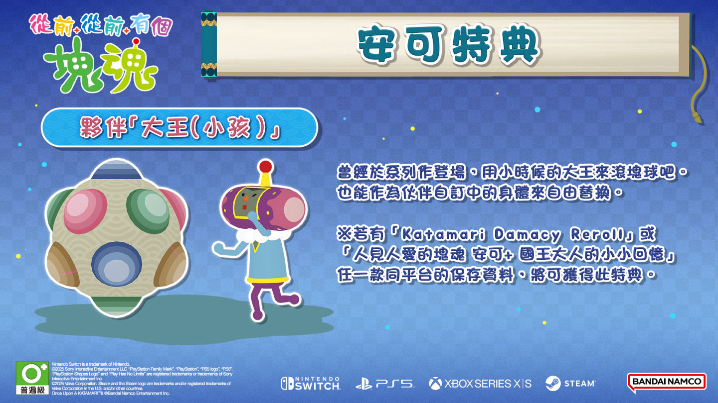玩家只要擁有《Katamari Damacy REROLL》或《人見人愛的塊魂 安可+ 國王大人的小小回憶》其中一款作品於相同平台上的保存資料,即可獲得特典「夥伴『大王(小孩)』」。