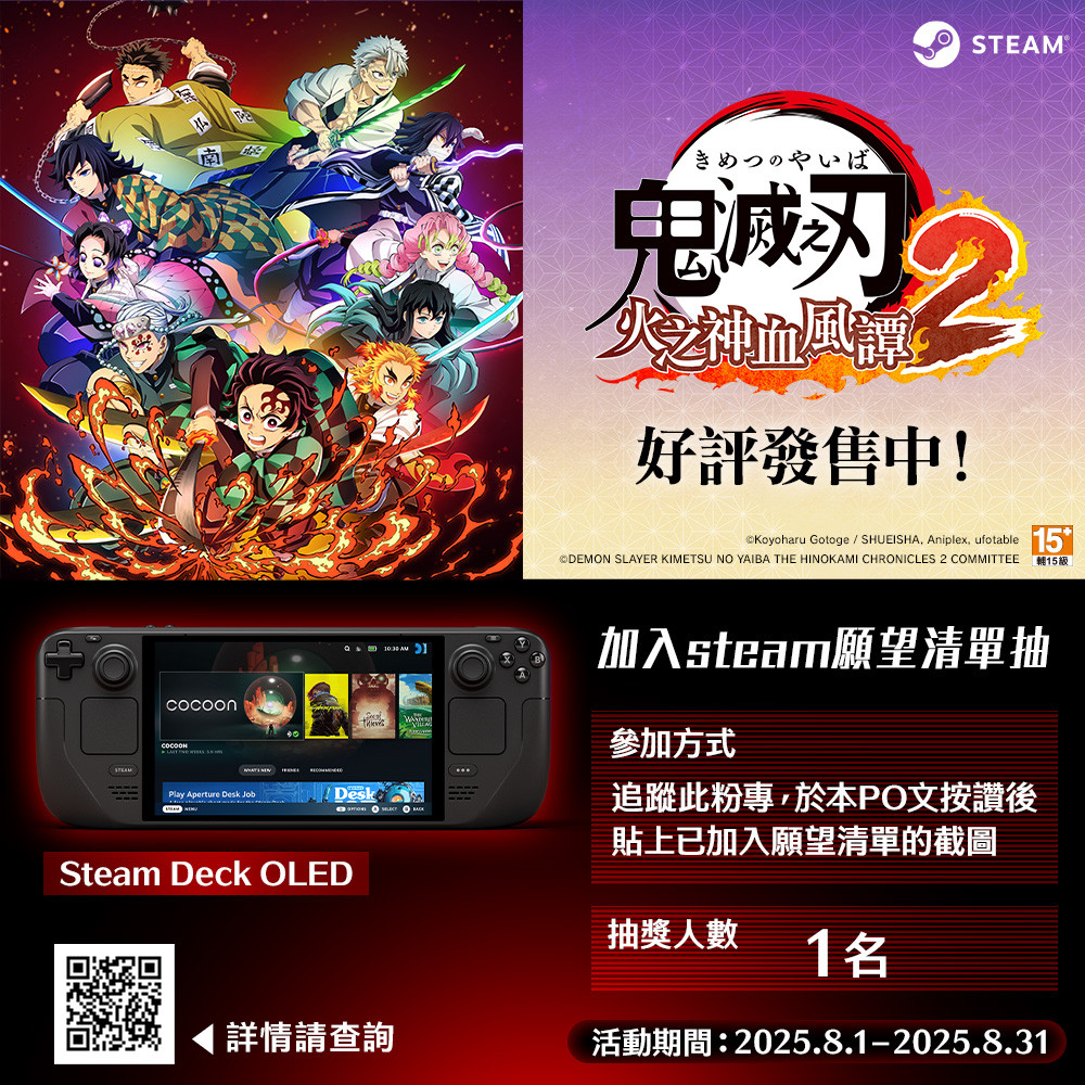 除了觀影好禮,粉絲們只要將遊戲《鬼滅之刃 火之神血風譚2》加入 Steam 願望清單,並填寫官方指定登記表單,就有機會抽中超人氣掌機「Steam Deck OLED」,將《鬼滅之刃 火之神血風譚 2》體驗帶著走!