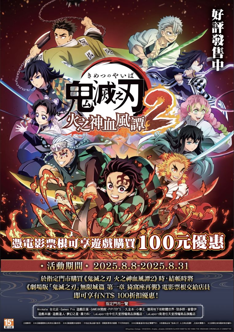 更不容錯過的還有購買優惠活動,於指定實體門市購買《鬼滅之刃 火之神血風譚2》時,出示《劇場版「鬼滅之刃」無限城篇 第一章 猗窩座再襲》電影票根,結帳即享 NT$100 元現金折扣,回饋鐵粉熱情支持!