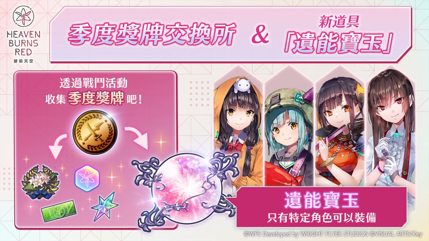 新推出的季度獎牌交換所也將於 8 月 3 日同步開放,玩家透過「積分挑戰」、「恆星掃蕩戰線」等內容獲得的「季度獎牌」,可兌換「石英」及「萬能戰型碎片(SS 靈魂共振)」等豪華報酬。其中,新道具「遺能寶玉」是可供朝倉可憐、豐後彌生、柳美音、李映夏等特定角色裝備的飾品。
