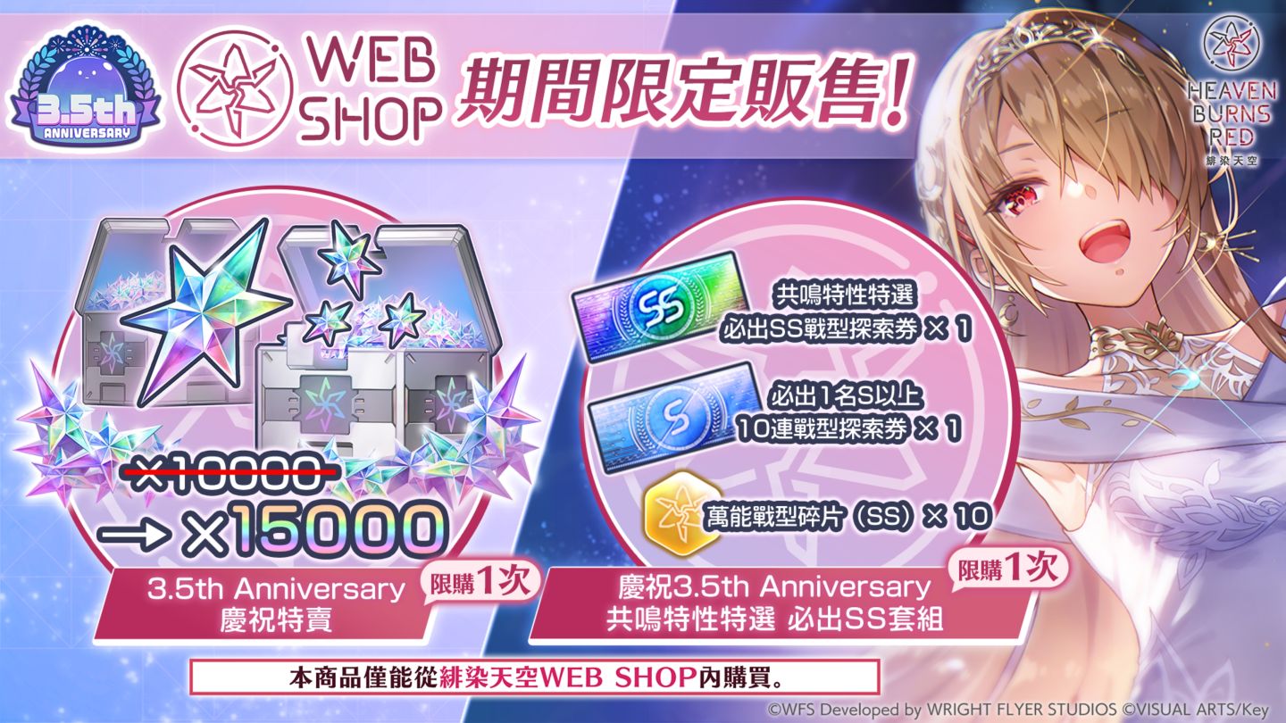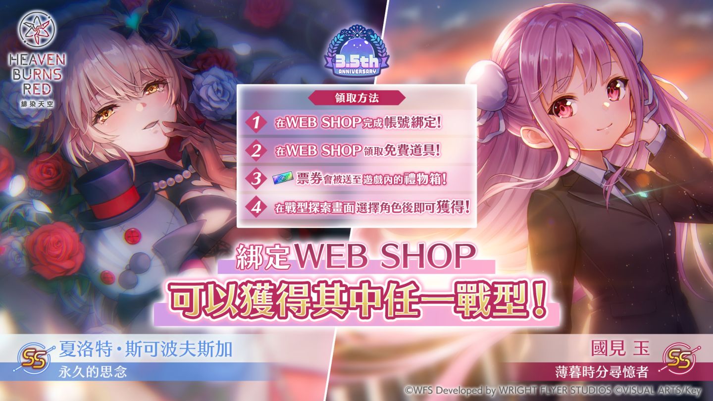 在玩家綁定「緋染天空 WEB SHOP」後,即可免費獲得「SS[永久的思念]夏洛特‧斯可波夫斯加」或「SS[薄暮時分尋憶者]國見玉」其中一種戰術型態。WEB SHOP 並將推出兩款 3.5 週年限定販售商品,以及比應用程式內更優惠的禮包與石英。