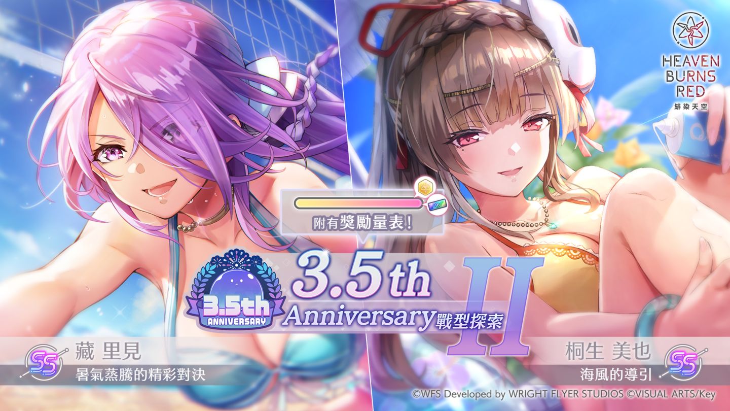 此外,「3.5th Anniversary戰型探索Ⅱ」將推出身穿泳裝的 SS 級戰術型態角色,包含「SS 靈魂共振[海風的導引]桐生美也」與「SS 靈魂共振[暑氣蒸騰的精彩對決]藏里見。