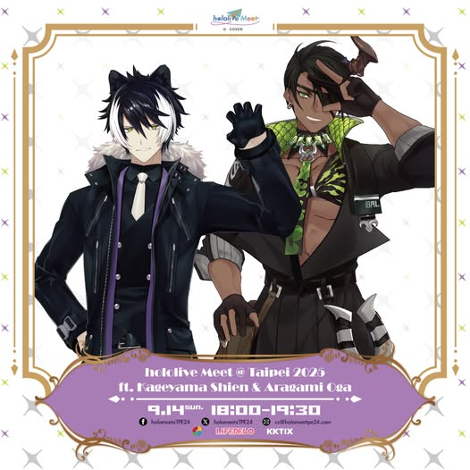 首先隸屬於 hololive producion 男性 VTuber 團體 HOLOSTARS 的影山紫炎(Kageyama Shien)與荒咬皇牙(Aragami Oga),將於 9 月 14 日在台北花漾展演空間舉行首次的台北專場演出。此組合將描繪獸人世界中的黑手黨 BOSS 與來自異世界退伍軍人之間的精彩互動。