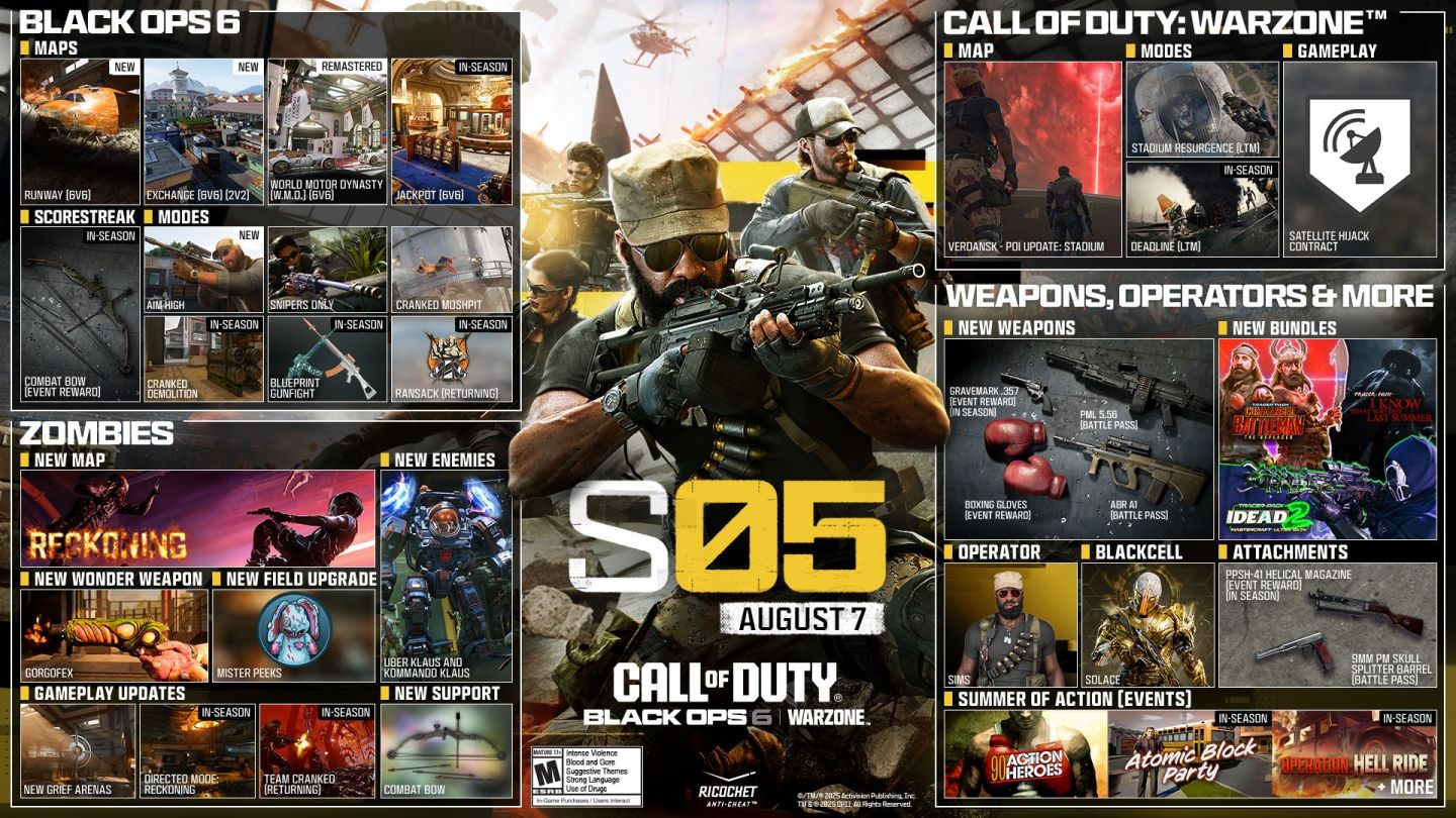 8 月 8 日(五)起登場的《決勝時刻:黑色行動6》與《決勝時刻:現代戰域》第 5 賽季,玩家將與戰術猛將西蒙斯一同肩負剷除萬神殿內奸的任務,並迎接令人熱血沸騰的三張多人遊戲地圖、全新的「打頭陣」多人遊戲模式、精采的《黑色行動6》殭屍模式劇情最終章,面對降臨在《現代戰域》經典大逃殺地圖「佛丹斯科」的毀滅性力量,還可加入即將到來的「九零年代動作片英雄」活動,全程享受高強度的動作片體驗!