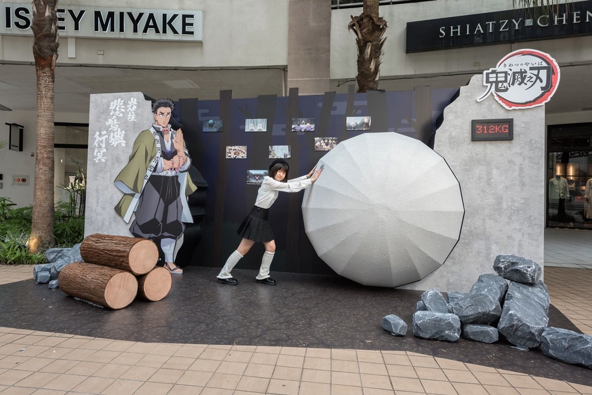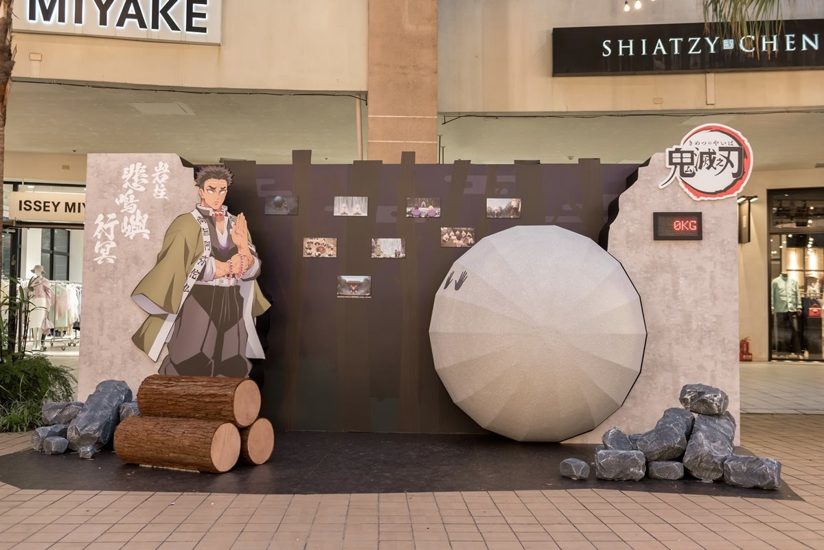 林口店打造多處沉浸式打卡亮點,其中Ⅰ館中央廣場「五柱燈庭‧心技映照之院」以日式燈籠交織出光影,顧客可轉動燈箱與五位「柱」合影。「風蛇修練場」呈現訓練場景,顧客能模仿風柱揮刀挑戰,看看是否能精準擊中木樁凹槽,也能感受蛇柱的靈巧身法!「岩柱的力之試煉」展現岩柱的堅毅精神,將手搭上趣味滾石裝置,還能測試自己的力量值。Ⅱ館東側廣場更有高達3米的「蛇柱」超萌氣偶,是絕對不容錯過的打卡點!