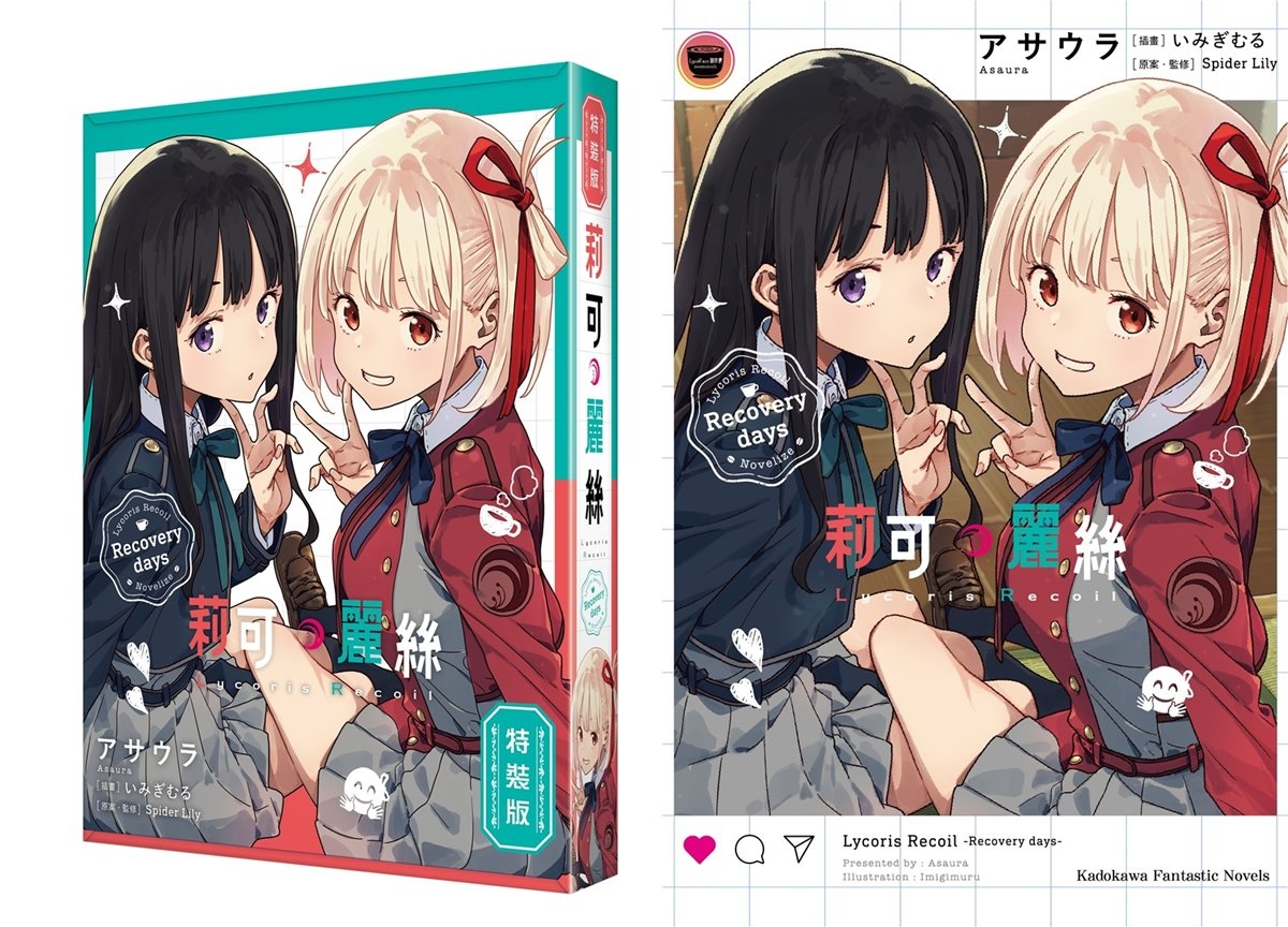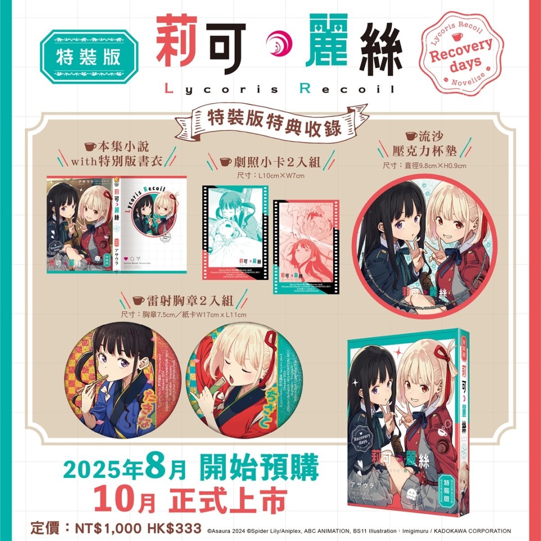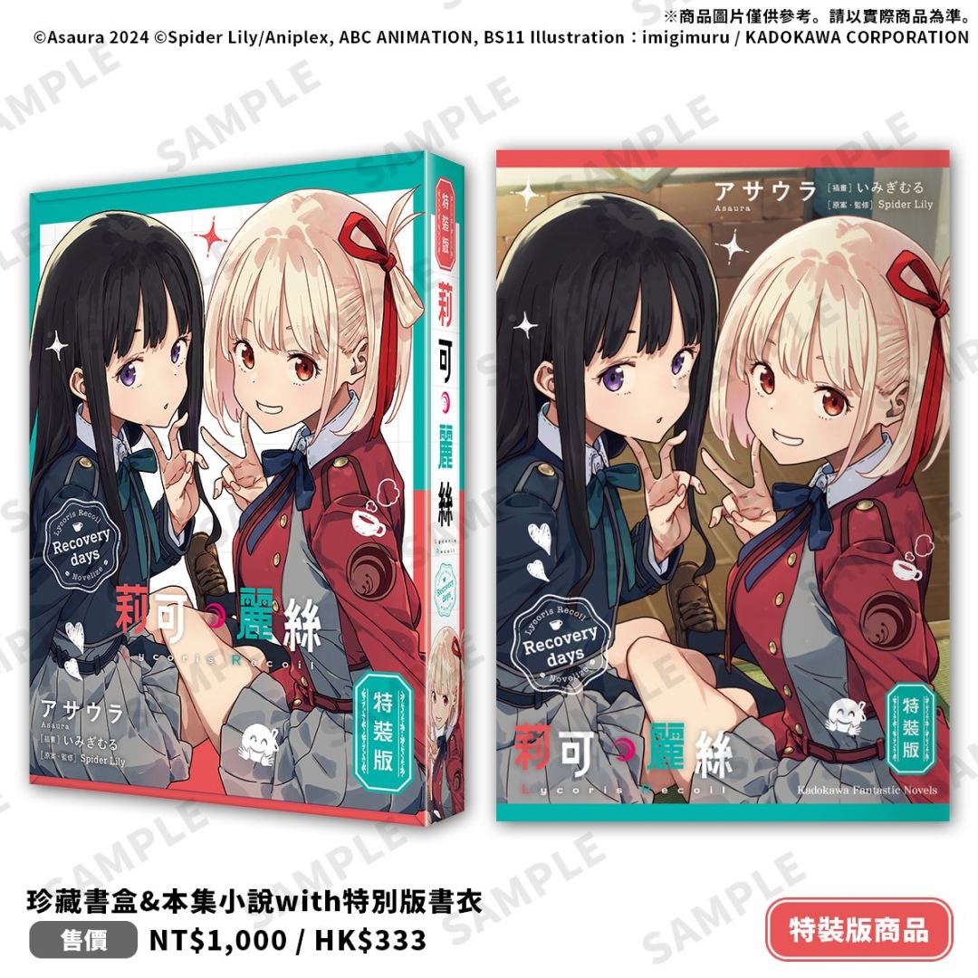 由插畫家いみぎむる繪製插圖的《Lycoris Recoil 莉可麗絲 Recovery days》特裝版,延續 LycoReco 咖啡廳風格的主題設計,以「錦木千束」&「井之上瀧奈」兩位主角為特裝版珍藏書盒封面,收錄外盒延伸日常與街頭背景色調的「本集小說 with 特別設計書衣」;搖曳流沙帶來獨特視覺效果與實用性的「流沙壓克力杯墊」;呈現千束與瀧奈互動瞬間的「雷射胸章2入組」;以及捕捉兩位少女甜美互動的「劇照風小卡 2 入組」。特裝版開放事前預購至 8/14(四),於台灣角川官網完成預購再加碼贈送購物金 100 元(使用期限為60天)。