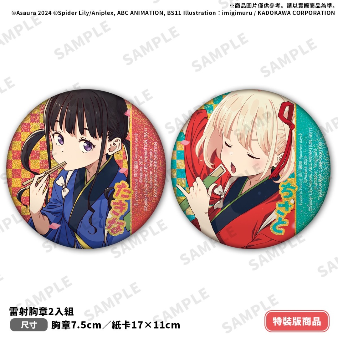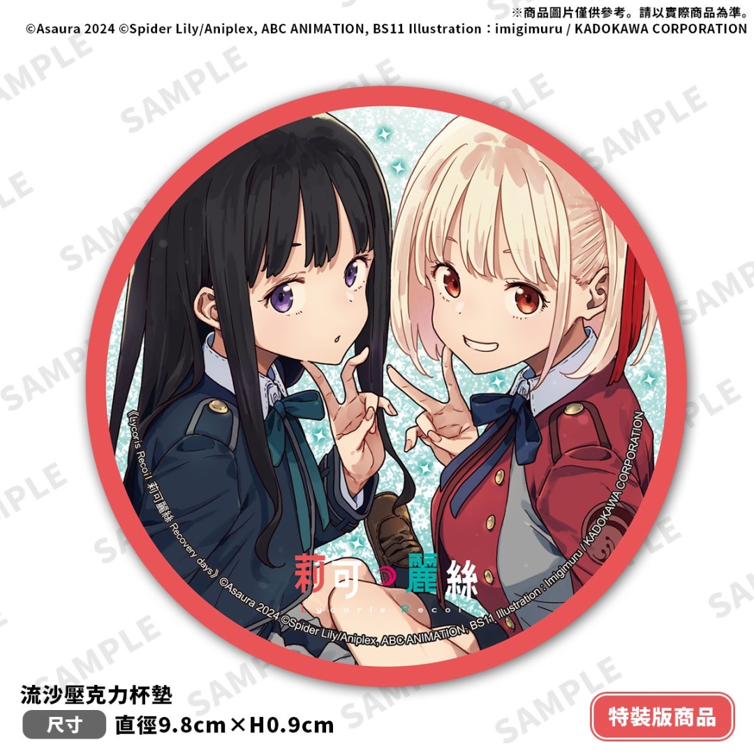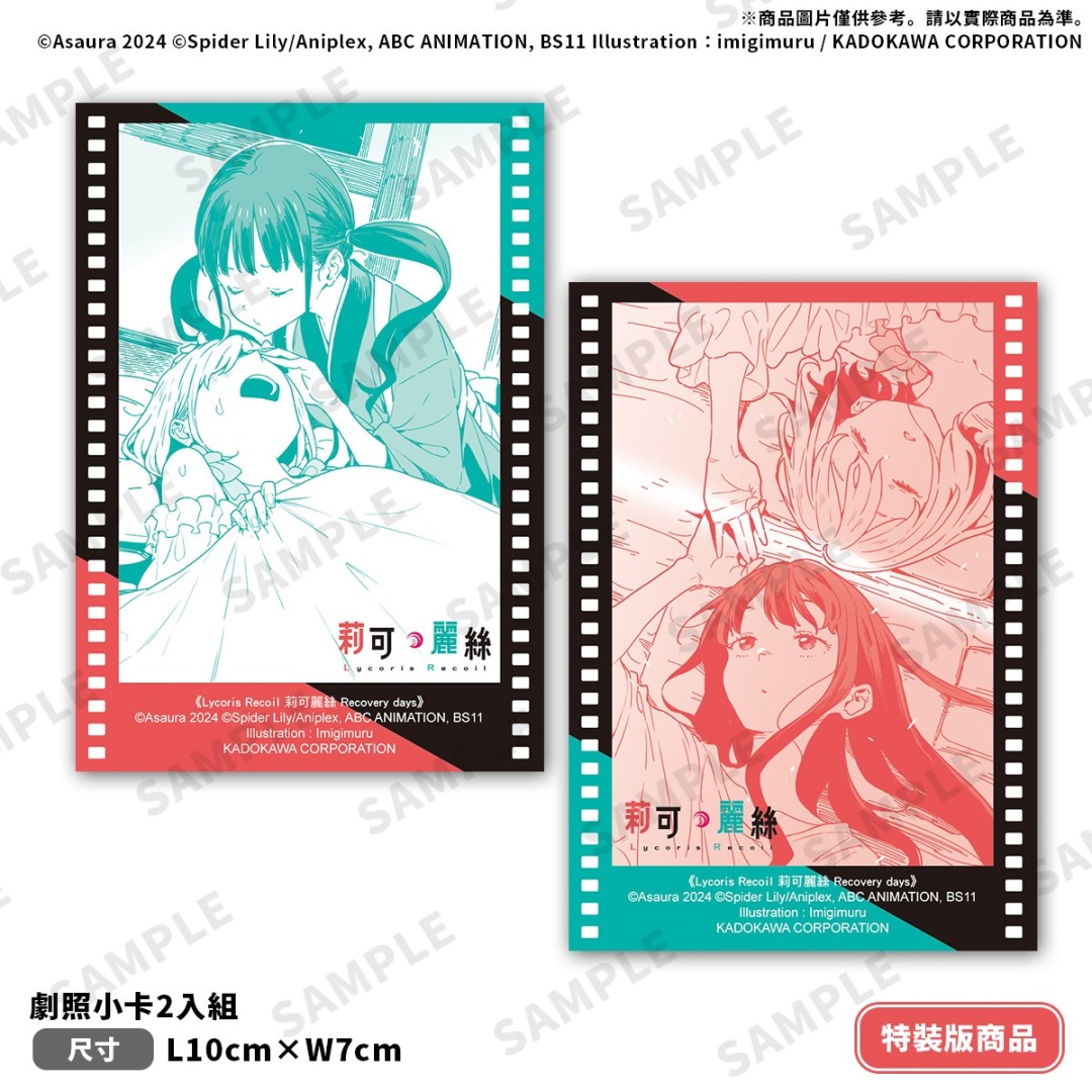 由插畫家いみぎむる繪製插圖的《Lycoris Recoil 莉可麗絲 Recovery days》特裝版,延續 LycoReco 咖啡廳風格的主題設計,以「錦木千束」&「井之上瀧奈」兩位主角為特裝版珍藏書盒封面,收錄外盒延伸日常與街頭背景色調的「本集小說 with 特別設計書衣」;搖曳流沙帶來獨特視覺效果與實用性的「流沙壓克力杯墊」;呈現千束與瀧奈互動瞬間的「雷射胸章2入組」;以及捕捉兩位少女甜美互動的「劇照風小卡 2 入組」。特裝版開放事前預購至 8/14(四),於台灣角川官網完成預購再加碼贈送購物金 100 元(使用期限為60天)。