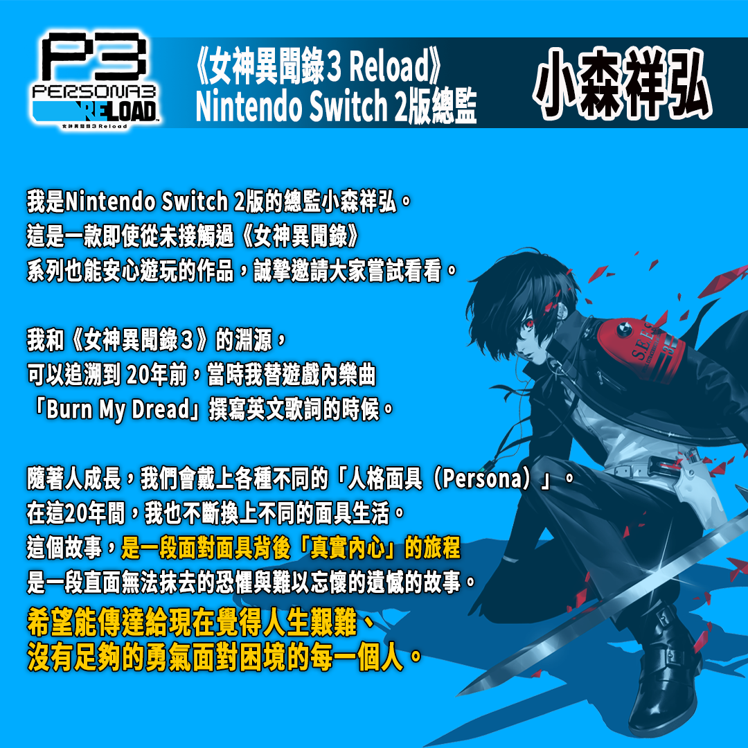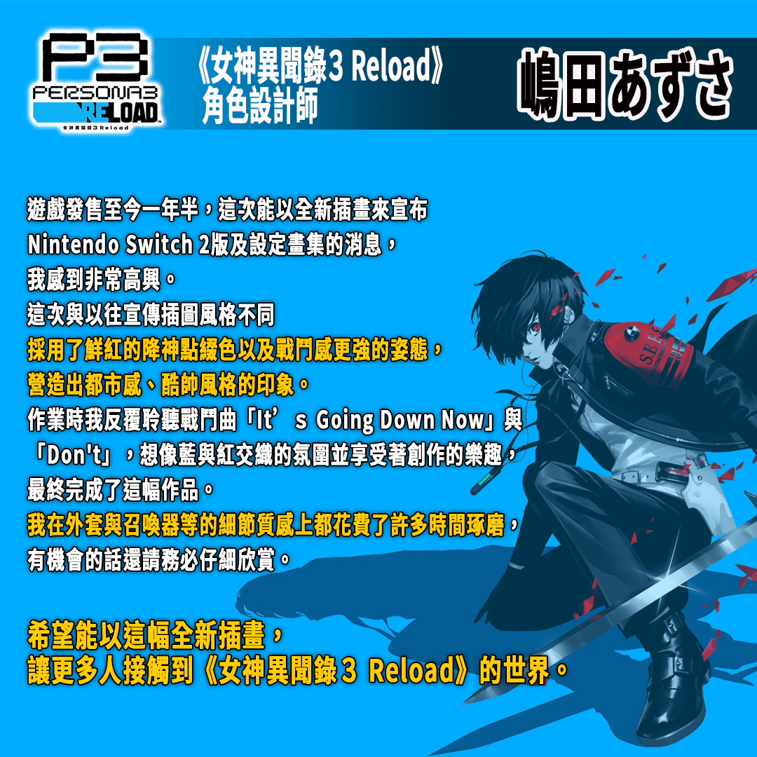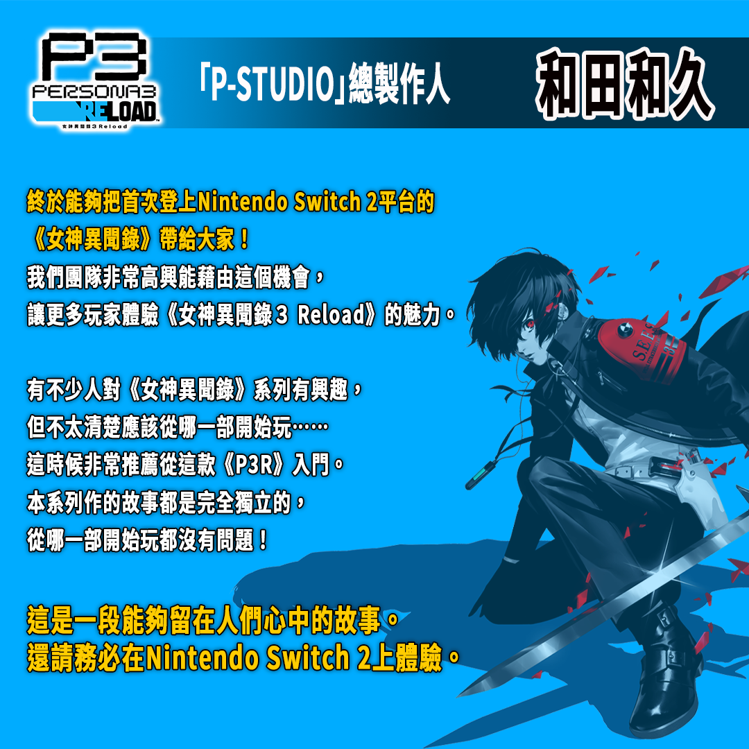 SEGA 世雅宣布,Atlus《女神異聞錄3 Reload》公開 Nintendo Switch 2 版(預定 2025 年 10 月 23 日發售)開發人員代表——P-Studio 總製作人「和田和久」、《女神異聞錄3 Reload》Nintendo Switch 2 版總監「小森祥弘」、角色設計師「嶋田あずさ」的寄語。