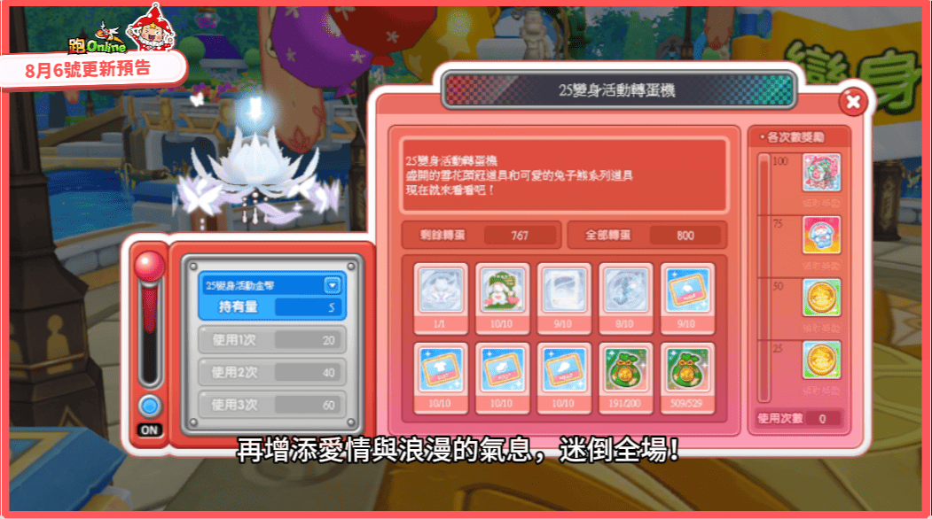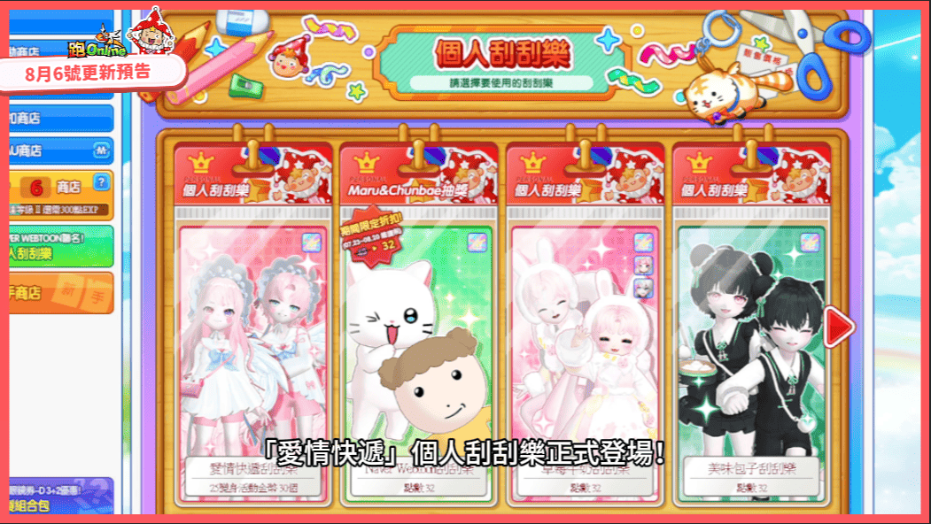 個人刮刮樂「愛情快遞」正式推出,搭配愛情主題外型,讓魅力值瞬間爆表!同步開放的「變身活動轉蛋機」則推出「兔子熊組合」,甜萌造型讓你成為公園與賽道中的焦點!