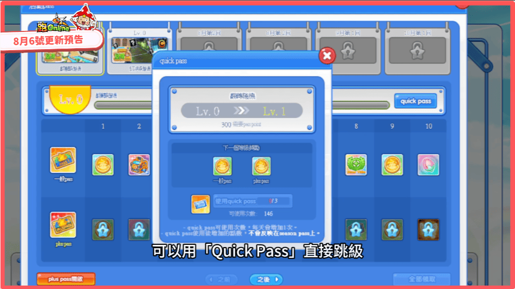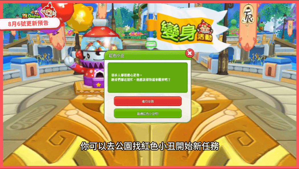 於活動期間,前往公園尋找 NPC「紅色小丑」即可接取變身專屬任務,完成後可獲得活動道具用於參與各種內容。同步啟動的「活動 Pass」與「Quick Pass」系統,讓玩家可透過完成任務與地圖挑戰累積點數,解鎖不同階段與類型的獎勵,還可選擇升級為 Plus Pass,獲得更多加碼好禮!8 月 6 日維護後至 8 月 20 日維護前。限時折扣優惠 288 點(原價 588 點)。