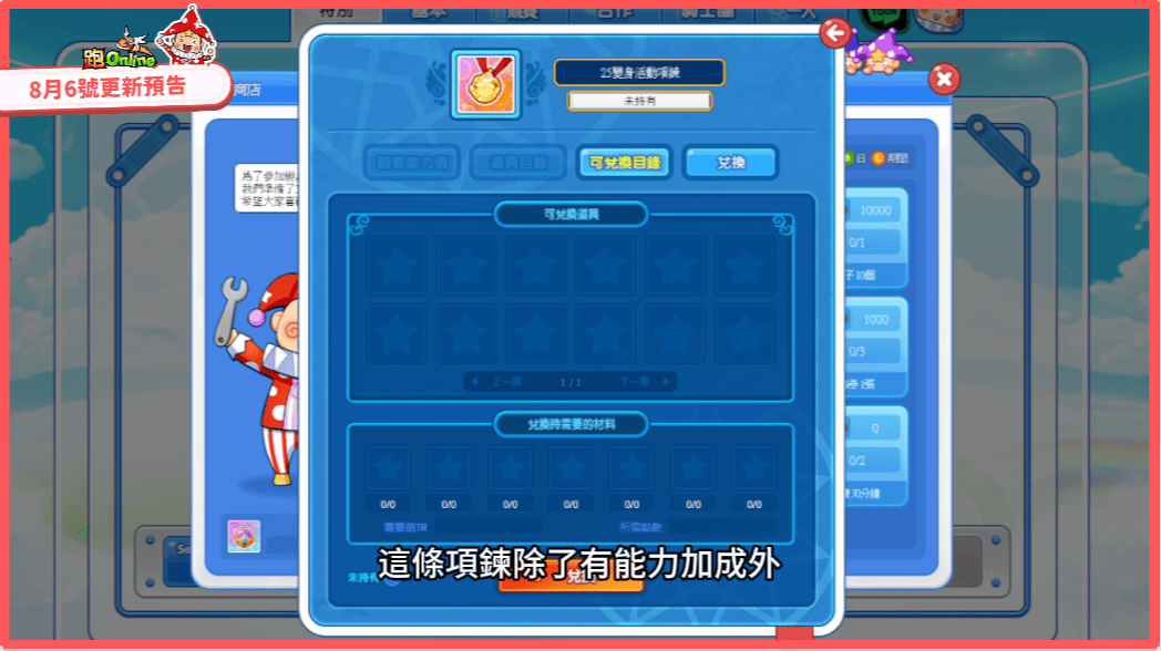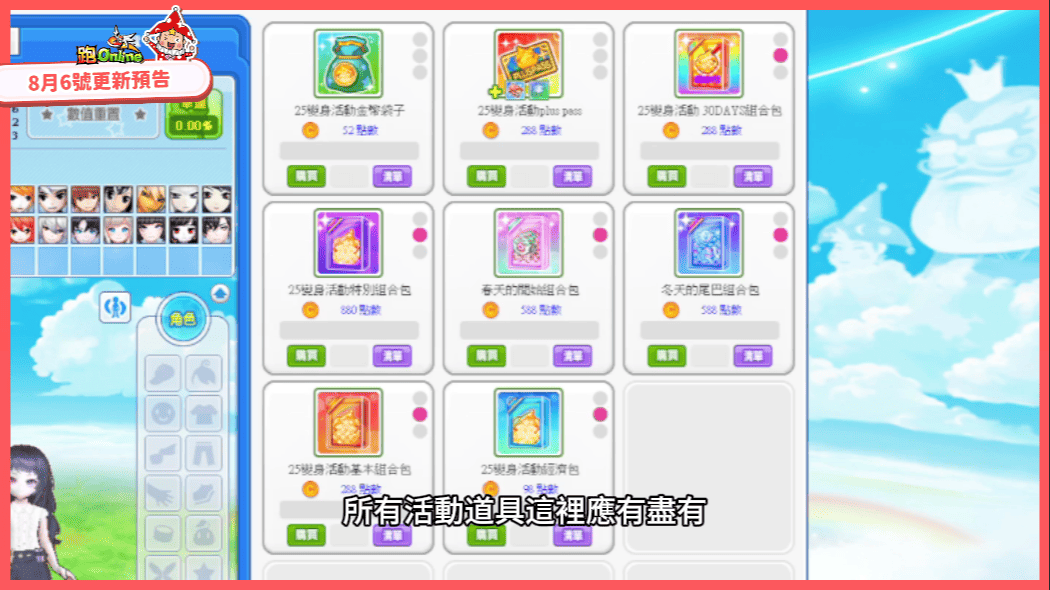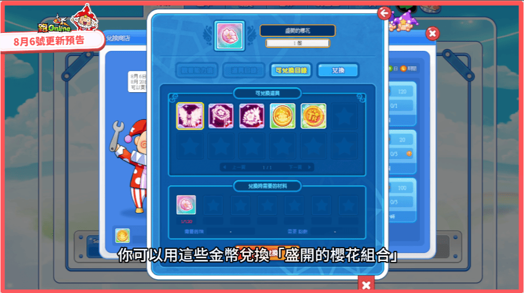 8 月 6 日至 8 月 20 日期間,「變身活動限定商店」限時開張!只要收集「25 變身活動金幣」,即可兌換「盛開的櫻花組合」與「盛開的雪花組合」等限定變身造型,「盛開的櫻花組合」為首件 SS+ 的手環,套裝具備全能力值 +1 的超強效果。此外,玩家還可使用全新「變更券」,自由兌換 2022 至 2024 年間的部分特定道具!