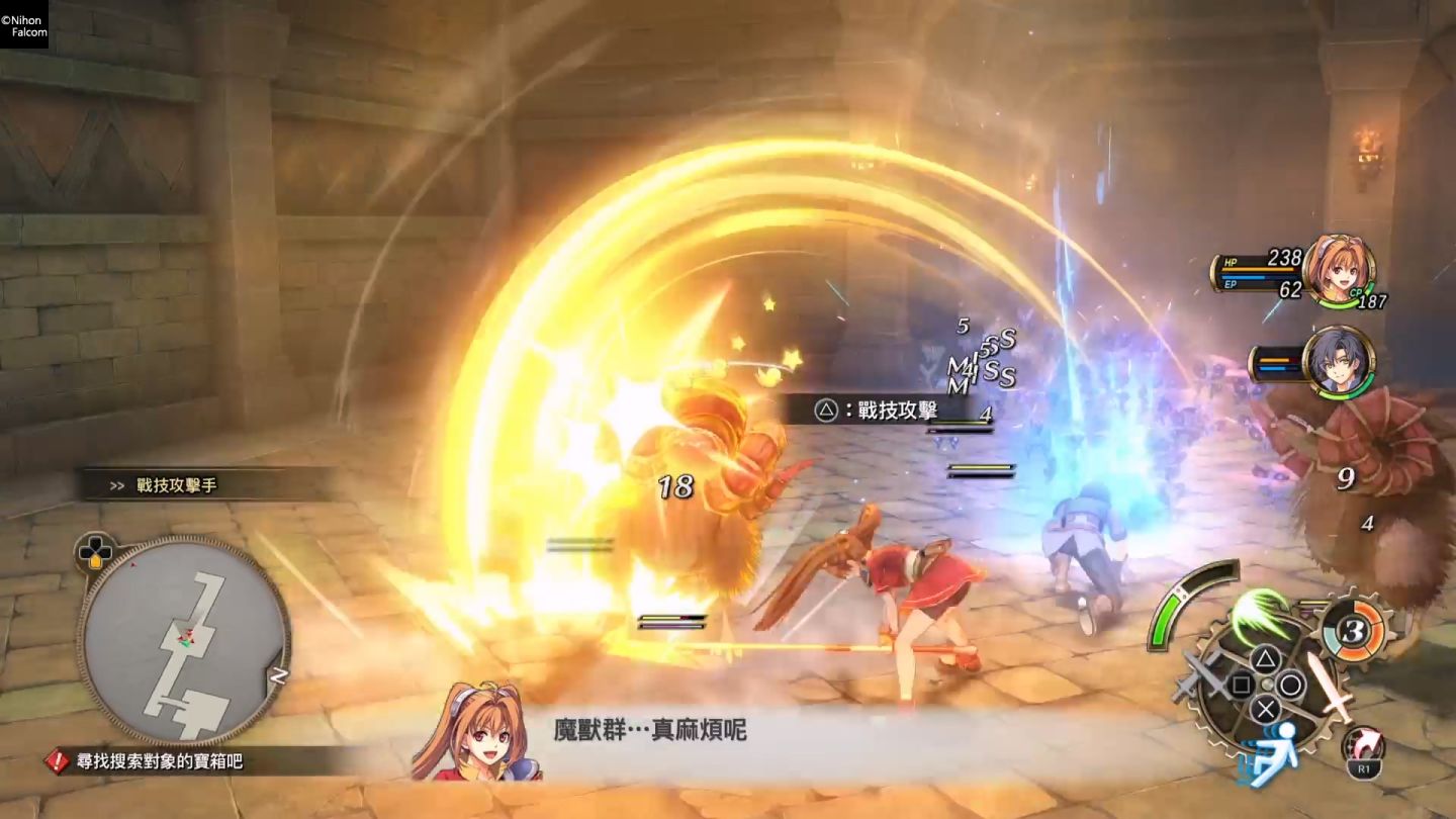 不過因為整體戰鬥變成了現代系統的緣故,而且更加快節奏下,回歸「軌跡」初期的雙人戰鬥,容錯率相對也下降許多,只要有一個角色被圍毆不支倒地,就會替戰鬥添加更加危險的局勢,因此在指令戰鬥狀態下,得盡量避免被圍爐的狀況發生。
