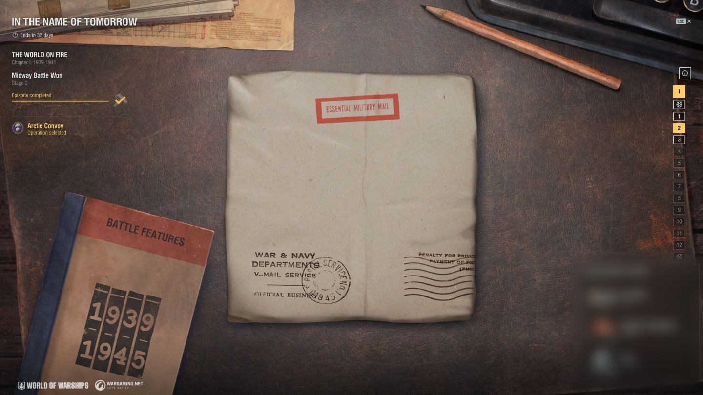 玩家在完成行動後,即可獲得星星,而在行動中獲得的星星可用以解鎖戰役階段,內容包含歷史故事、精彩影片,以及全新的主題獎勵,包括「水下爆炸」敵艦受毀效果、IX Iowa 的「凱旋」永久迷彩,以及帶有 10 個技能點數的指揮官 Robert Adams 本人。推進戰役進度,還可獲得全新的「1939–1945 編年史」收藏元素作為獎勵。完成整個戰役,即可獲得活動的主要獎勵:VIII San Diego。