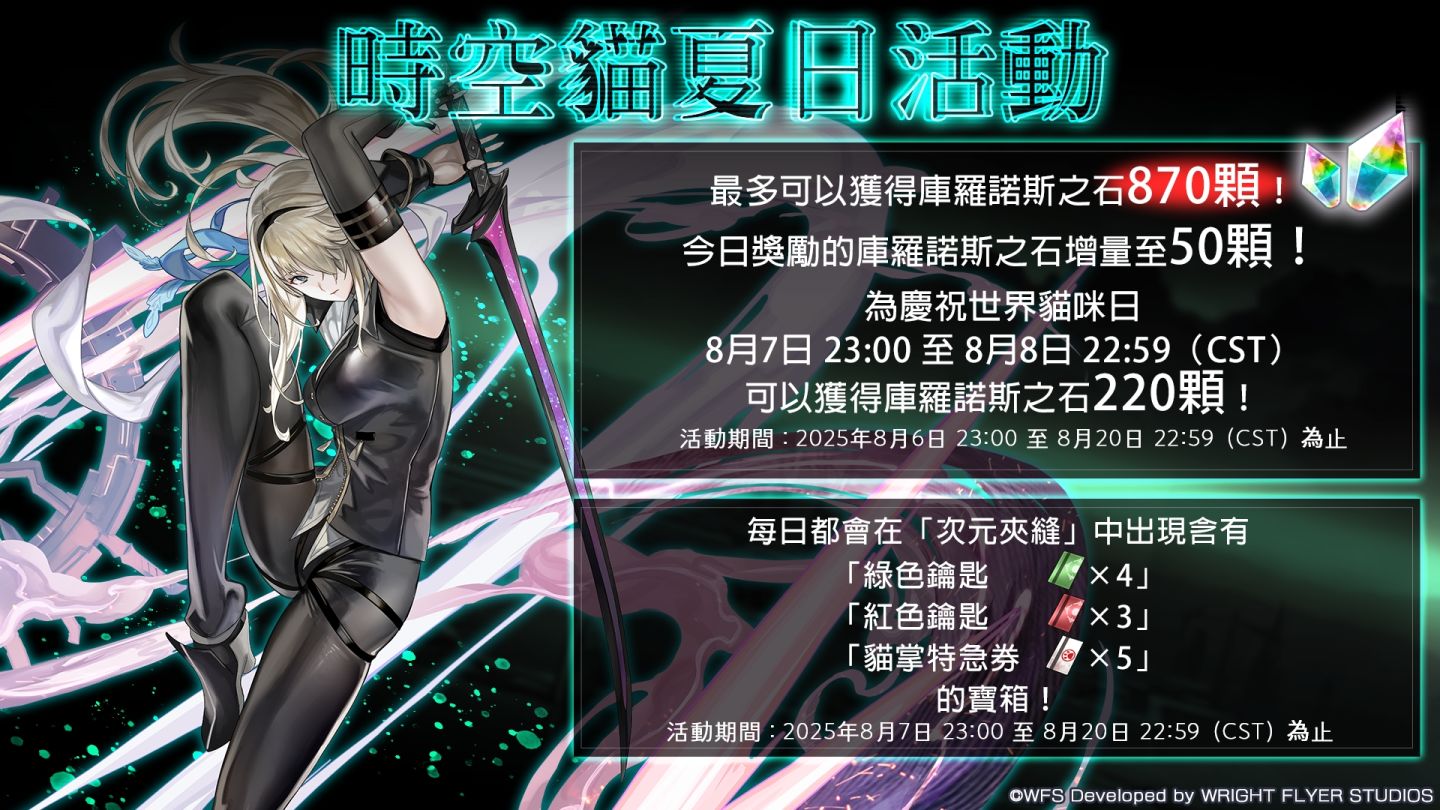 同時為慶祝世界貓咪日,2025 年 8 月 7 日 23:00 至 8 月 8 日 22:59(CST)為止的期間內,山貓將會送來今日特喵獎勵「庫羅諾斯之石 220 顆」。