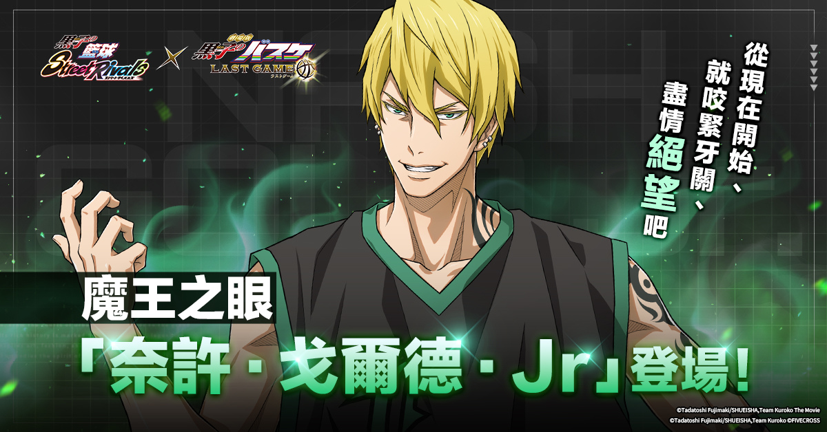 本次聯動《電影版 影子籃球員 LAST GAME》登場角色「奈許.戈爾德.JR」是來自美國街頭籃球的全能天才,率領 Jabberwock 隊大勝日本 Strky 隊後,公開羞辱日本球員,甚至放話「猴子沒資格打籃球」。