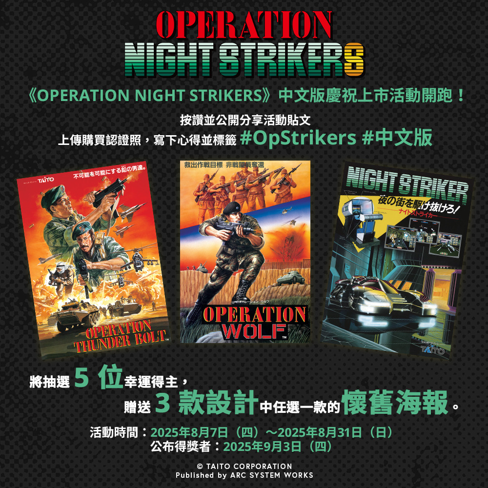 亞克系統亞洲 Arc System Works Asia 自即日起,正式推出由 Taito Corporation 發售的 Nintendo Switch《Operation Night Strikers》中文實體盒裝版與數位下載版,並舉辦慶祝上市活動,將贈送「特製布質海報」。