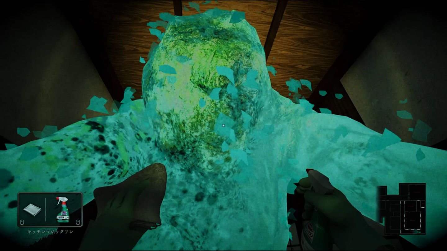 不過在玩家打掃整潔的時候,將會有某個會對掃除的聲音與玩家的腳步聲有所反應襲來的「某種存在」登場,玩家需要一邊逃離這些存在的襲擊,一邊安靜完成打掃工作。系統也會依照玩家的清掃程度與脫逃時間給予評價,並隨著評價為玩家帶來不同的分歧結局。