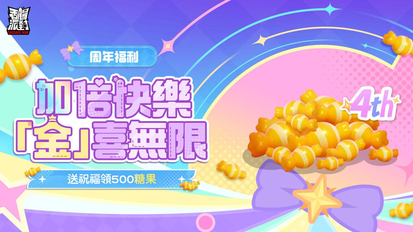 週年期間,腸腸只要每日登入遊戲並送出你對腸島的祝福,即可獲得 500 糖果獎勵!累積糖果還能兌換超多週年好禮,讓你的祝福化作豐收的喜悅,每天不漏打卡,把糖果通通帶回家!