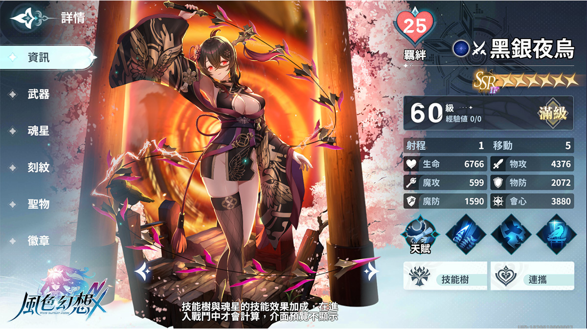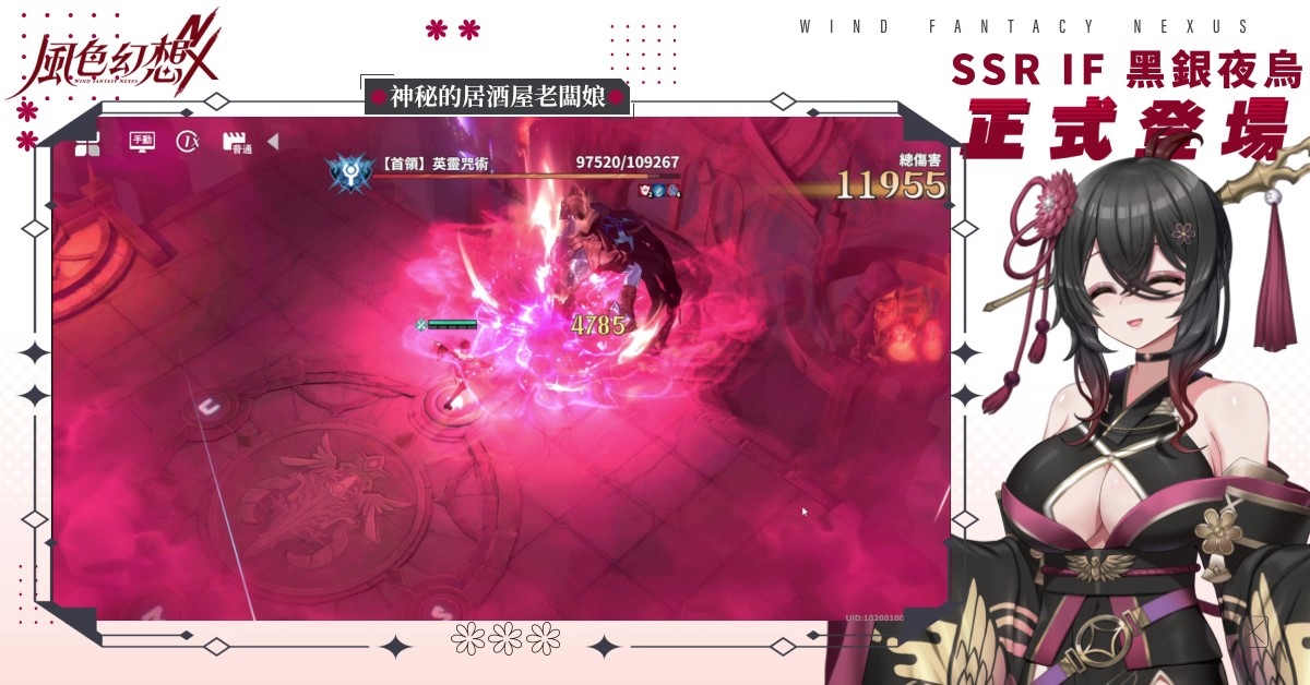 「黑銀夜烏」則為擅長單體爆發的「武鬥」職業,天賦技能「醉影秘襲」可在攻擊後對敵人附加「傷口」狀態,限制行動,並持續疊加自身「夜色」狀態,強化暴擊與魔防。專屬技能「影鴉鎖鞭」具備遠距收割能力,搭配「夜色」疊層後,能一回合橫掃全場,展現致命壓制力。